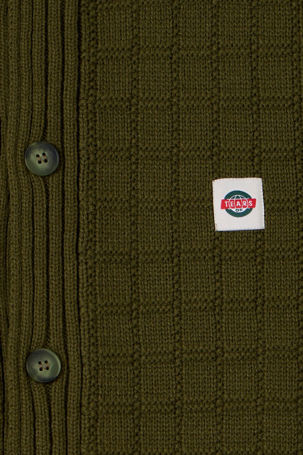 Вязаный кардиган из смесовой шерсти, отложной воротник, накладные карманы на передней части изделия, пуговицы с контрастным эмбоссированием. Ажурная вязка. Цвет: хаки.
