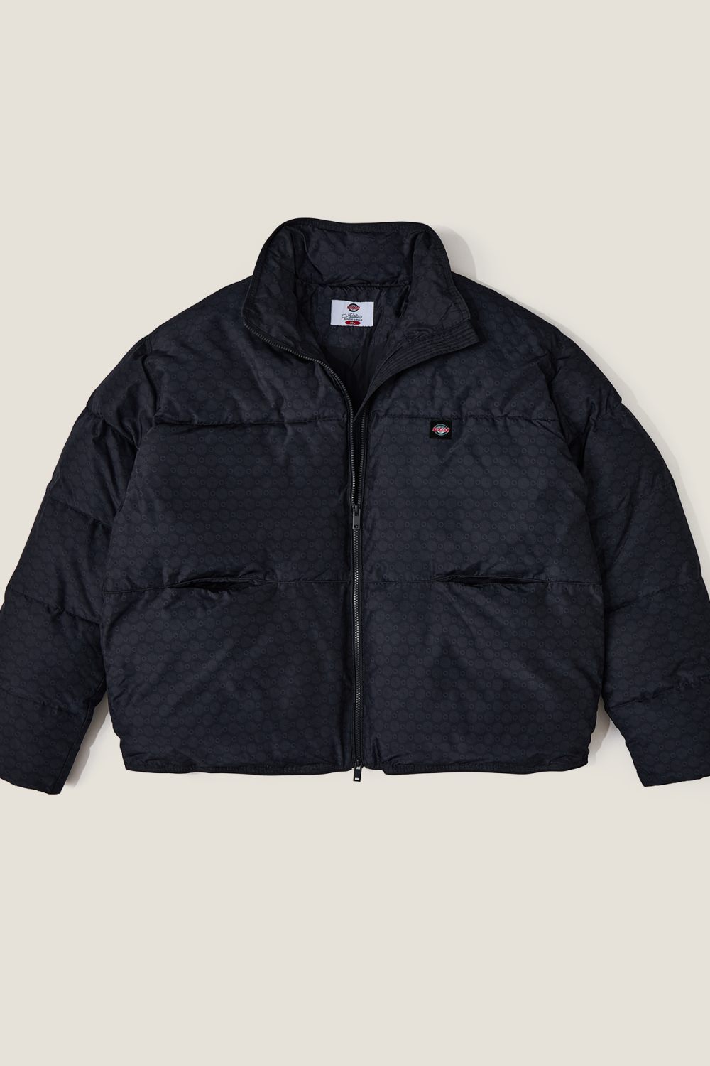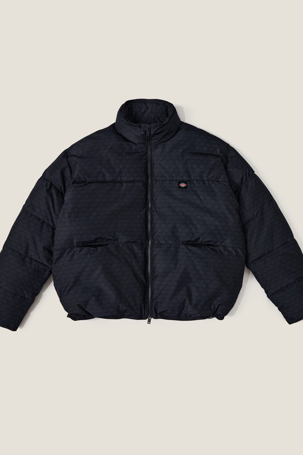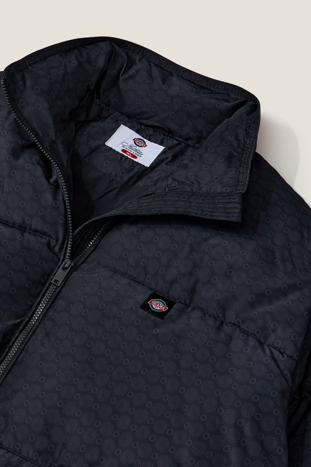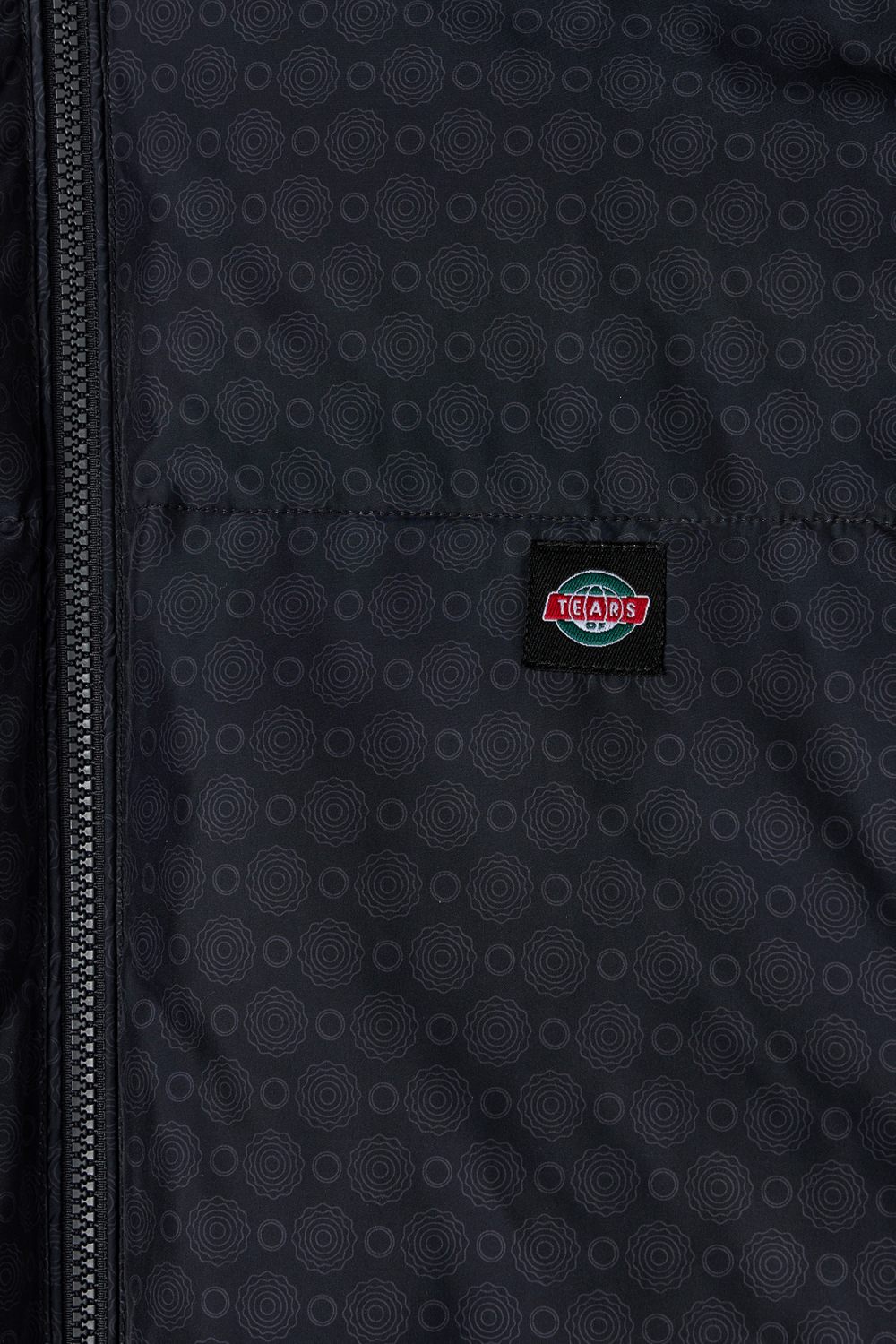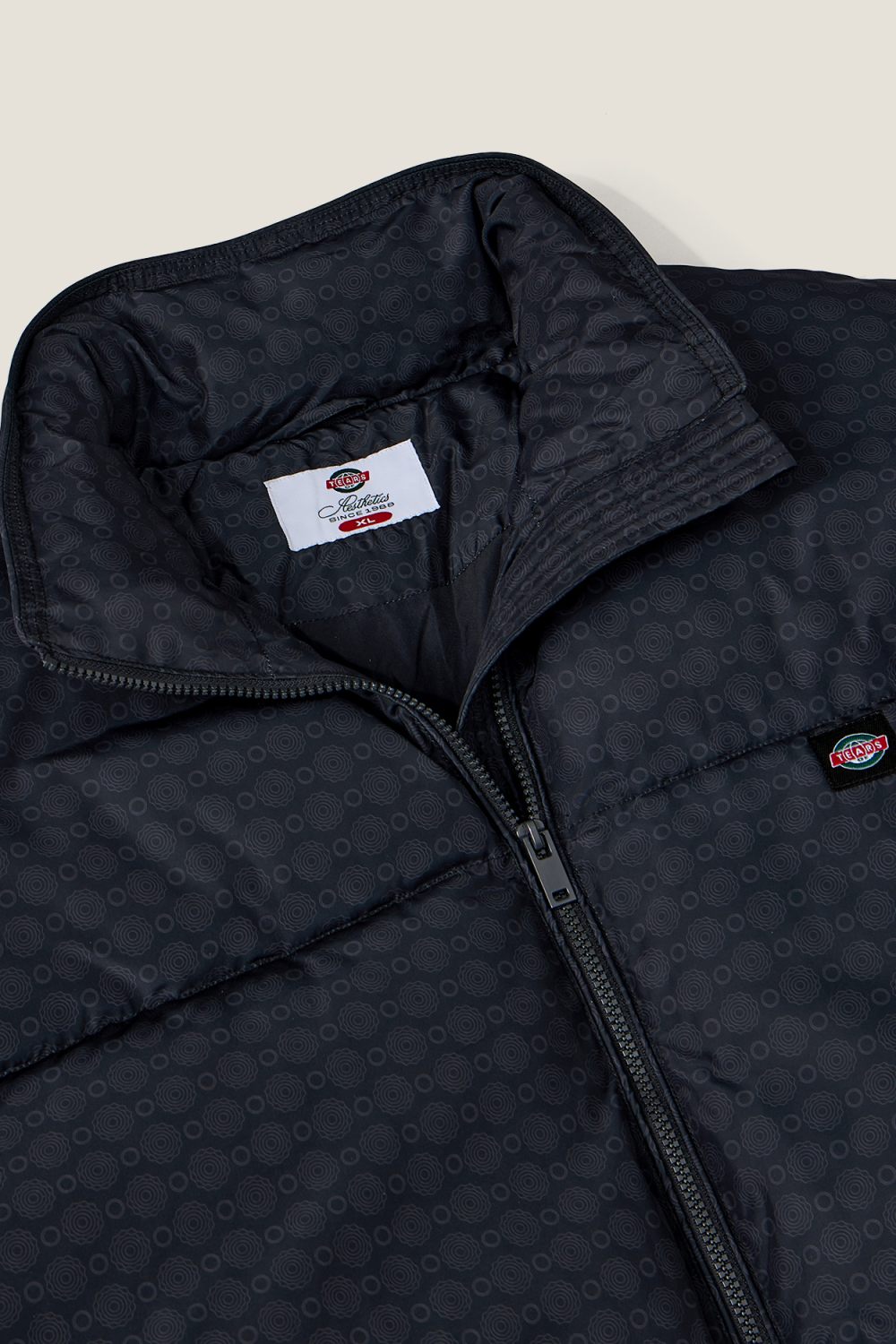 Пуховик черного цвета с принтом в тон изделия. Воротник стойка без капюшона. Фирменный нашивной лейбл на груди. Тип застежки: молния. Кулиски для затягивания по нижнему краю изделия. Эластичные трикотажные манжеты на рукавах. Изделие имеет три кармана: скрытые боковые и один внутренний. Наполнитель: утеплитель ethermaloft®recycle, который на 80% производится из переработанных и повторно используемых пластиковых изделий (по стандарту GPS*).