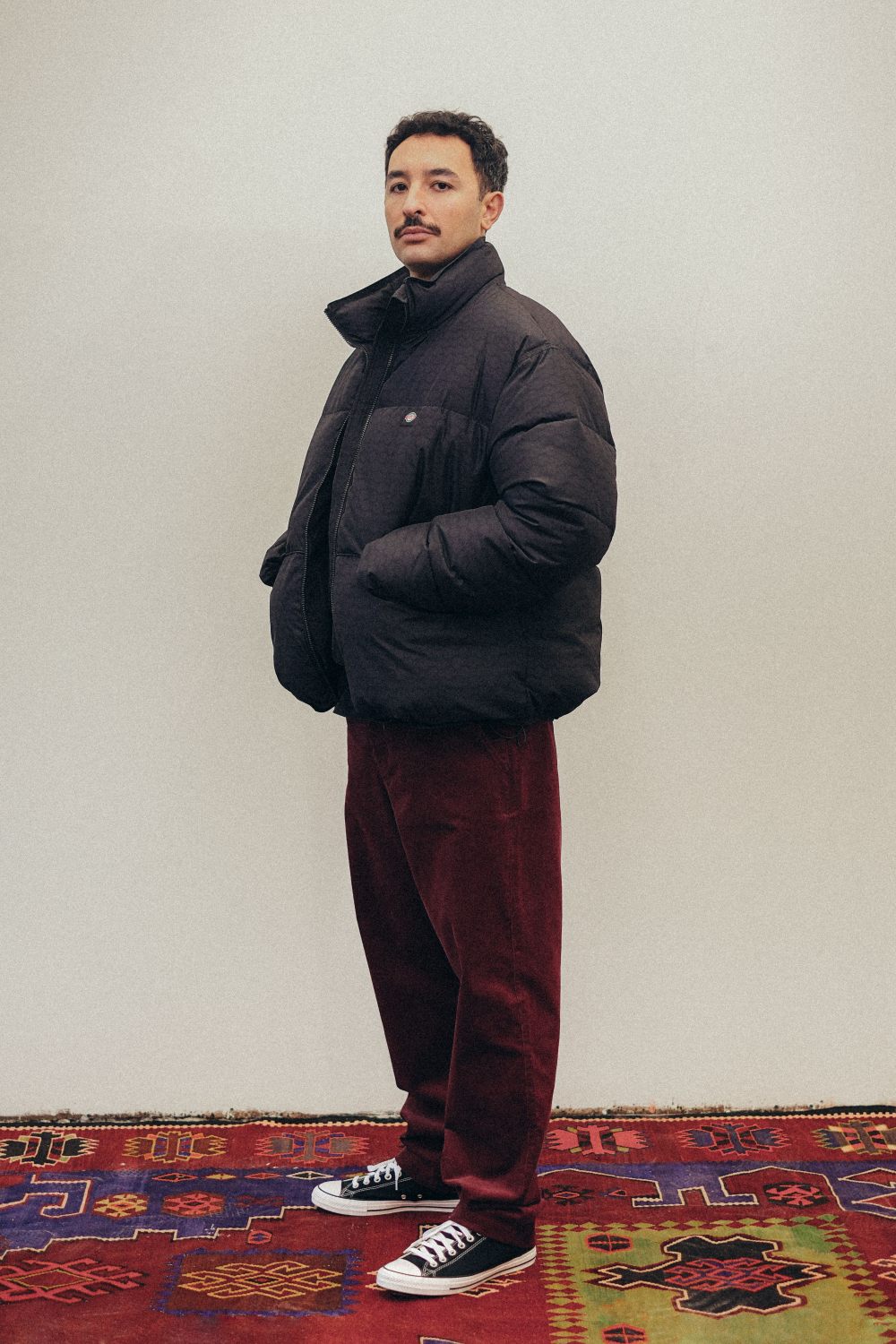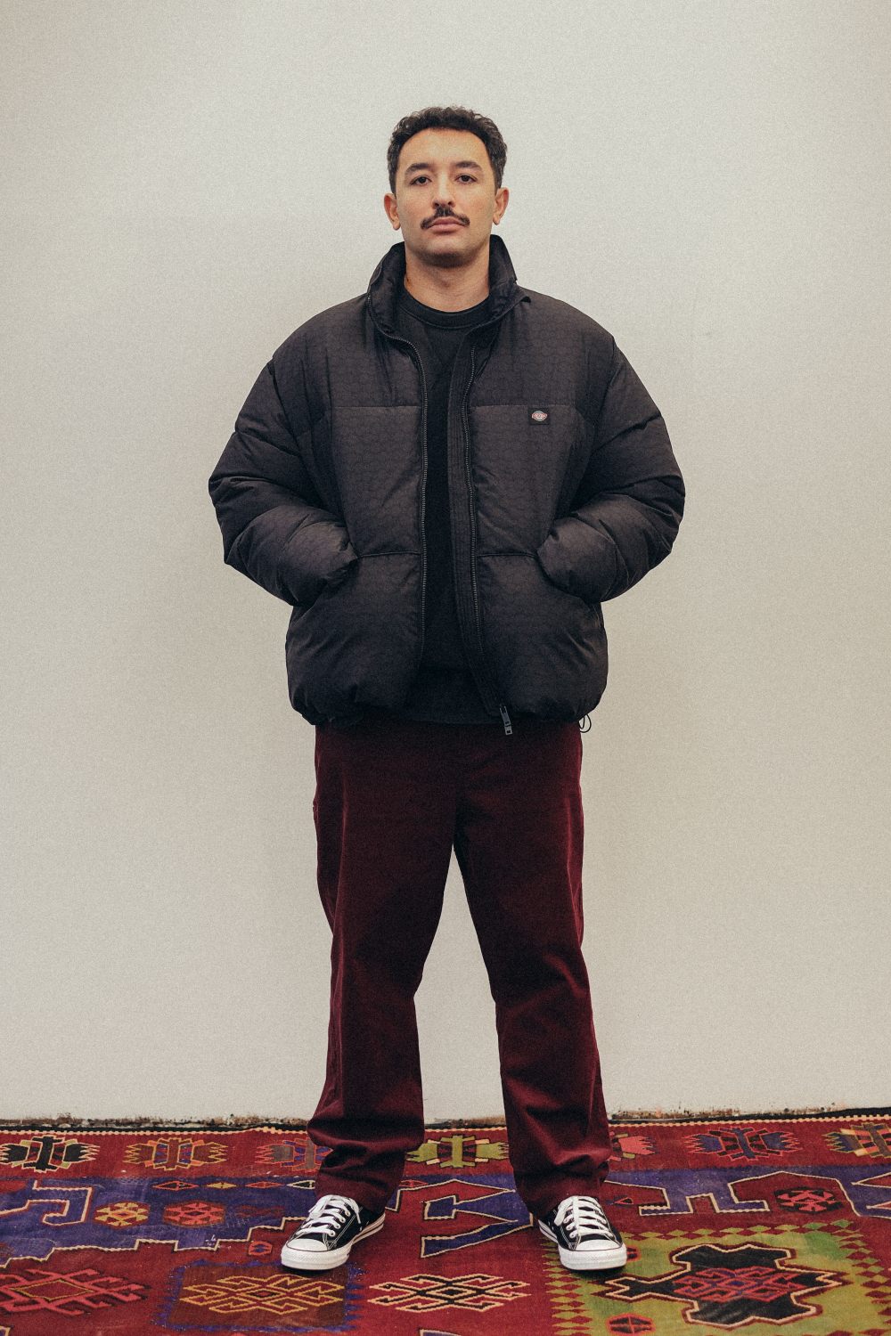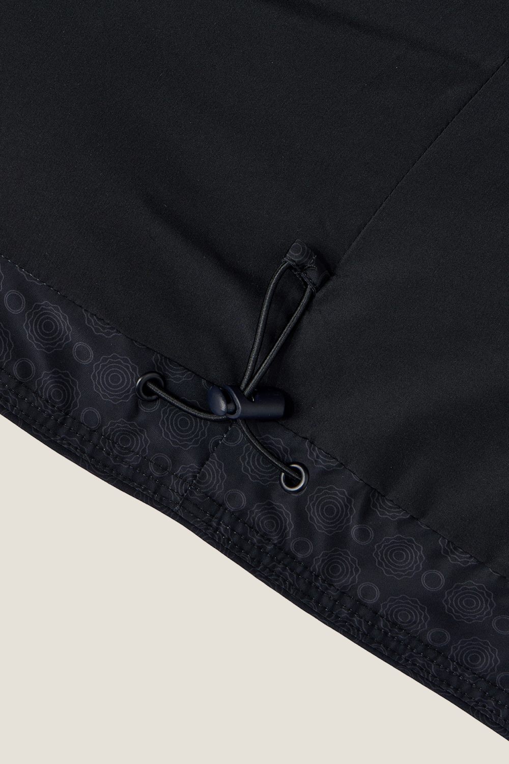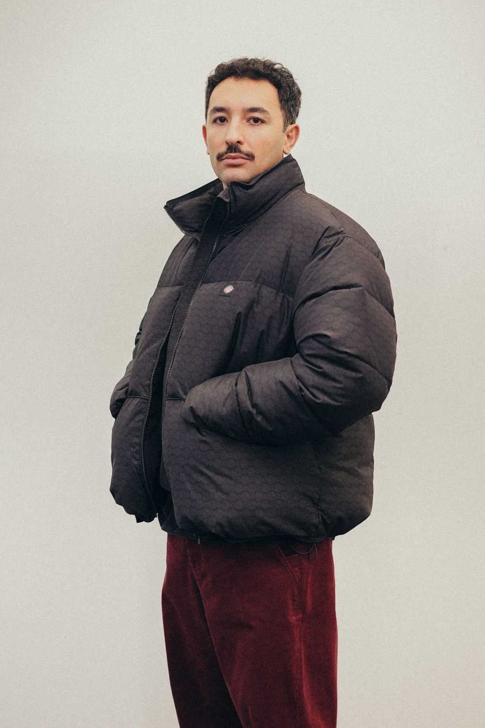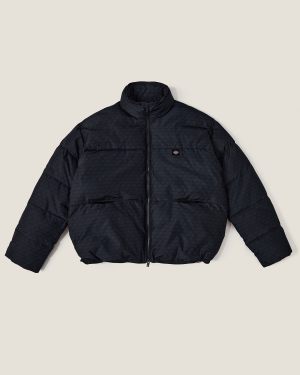 Пуховик черного цвета с принтом в тон изделия. Воротник стойка без капюшона. Фирменный нашивной лейбл на груди. Тип застежки: молния. Кулиски для затягивания по нижнему краю изделия. Эластичные трикотажные манжеты на рукавах. Изделие имеет три кармана: скрытые боковые и один внутренний. Наполнитель: утеплитель ethermaloft®recycle, который на 80% производится из переработанных и повторно используемых пластиковых изделий (по стандарту GPS*).