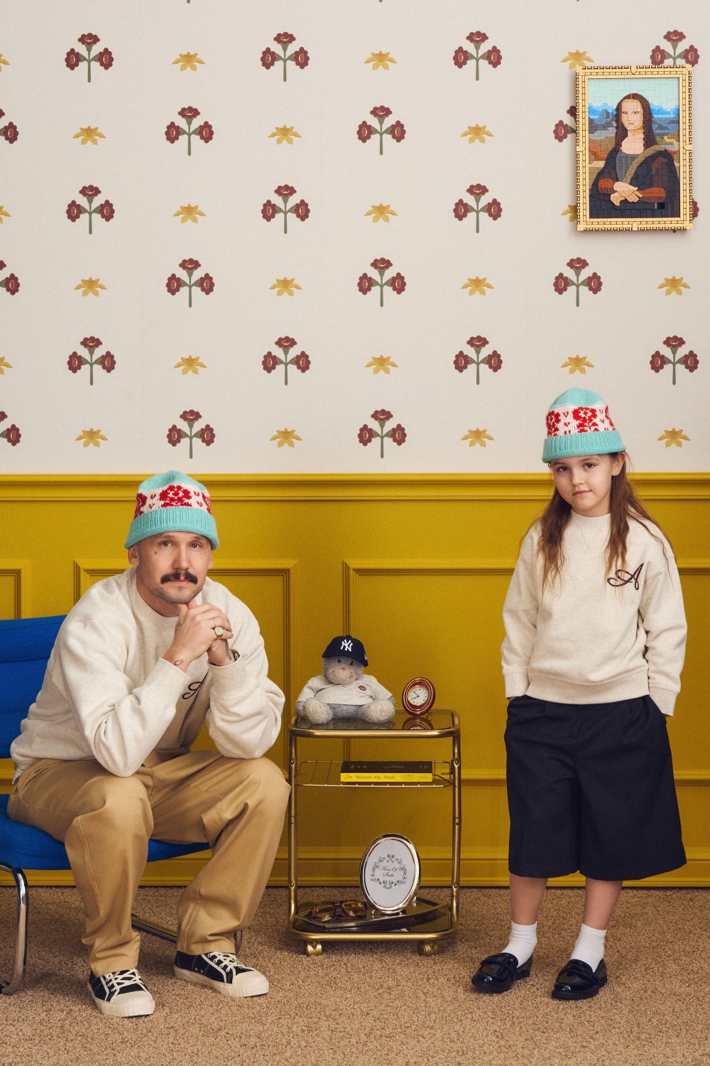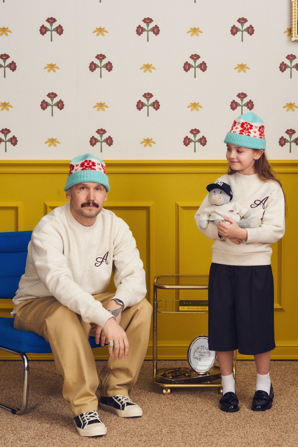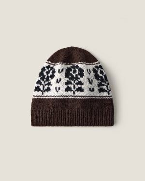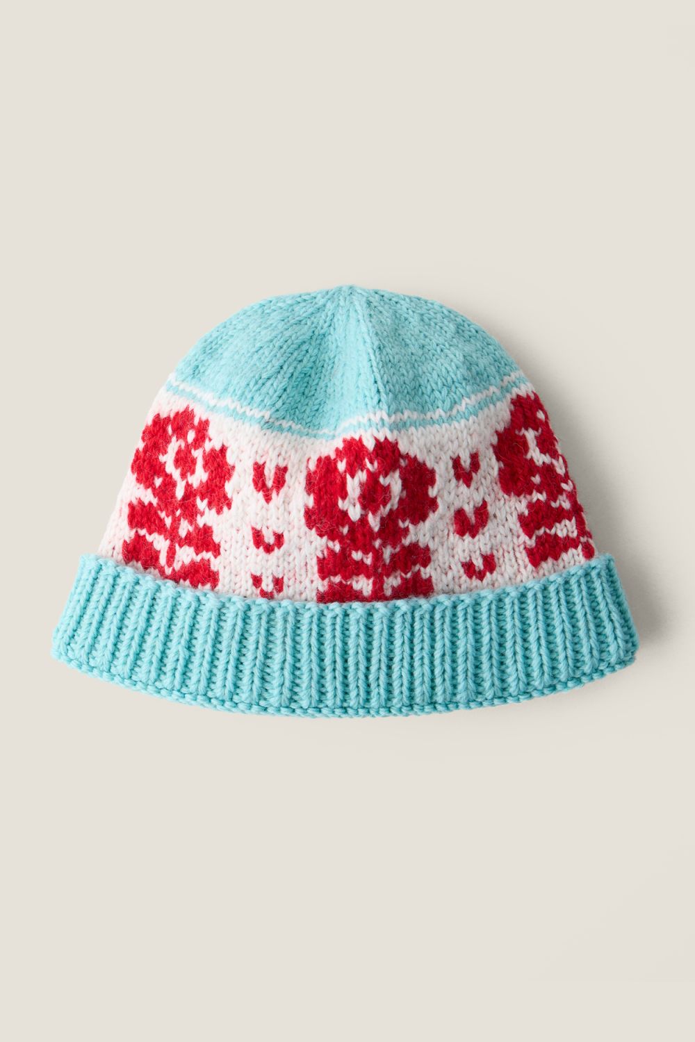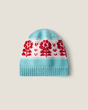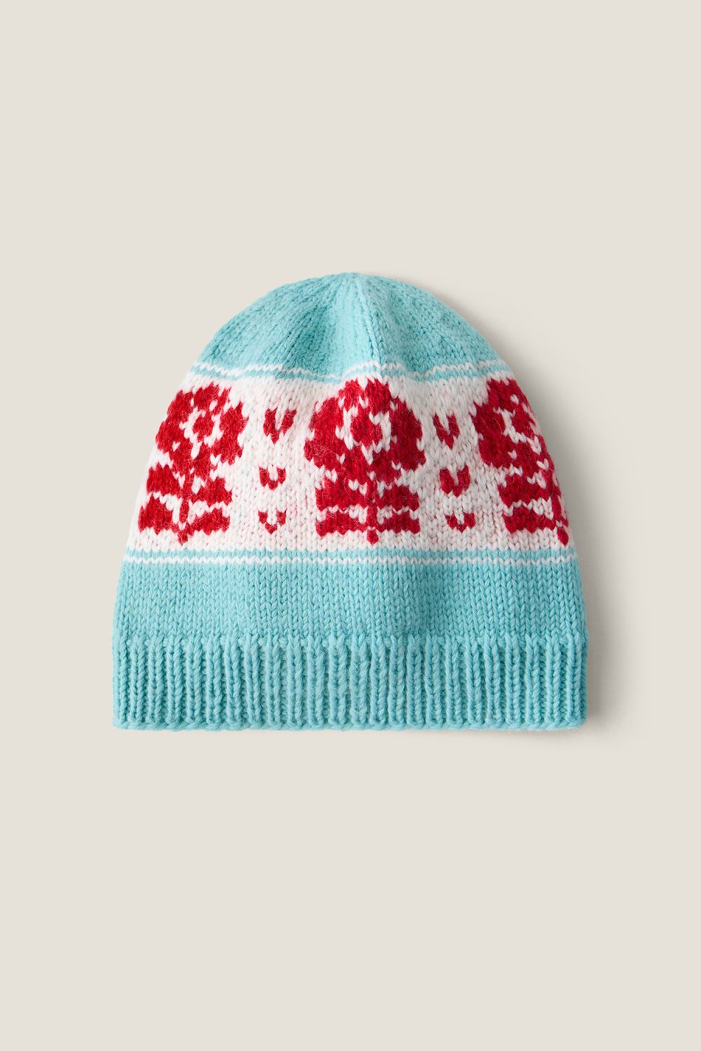 Вязаная шапка-бини из 100% натуральной шерсти голубого цвета. Каждая шапка создается вручную, процесс занимает около 6 часов. Элементы вяжутся жаккардом, волокна которого сцепляются между собой. Это делает изделия плотными и теплыми благодаря протяжкам нитей на изнанке.