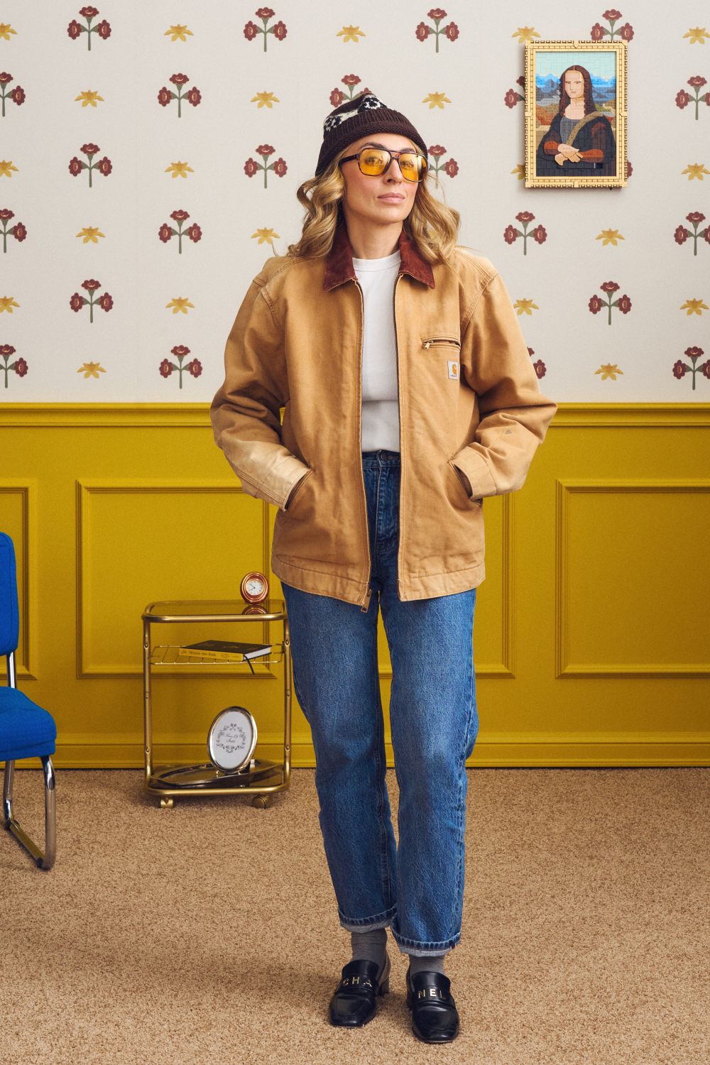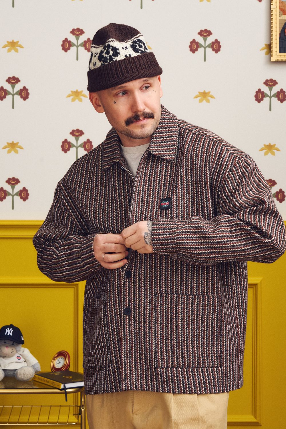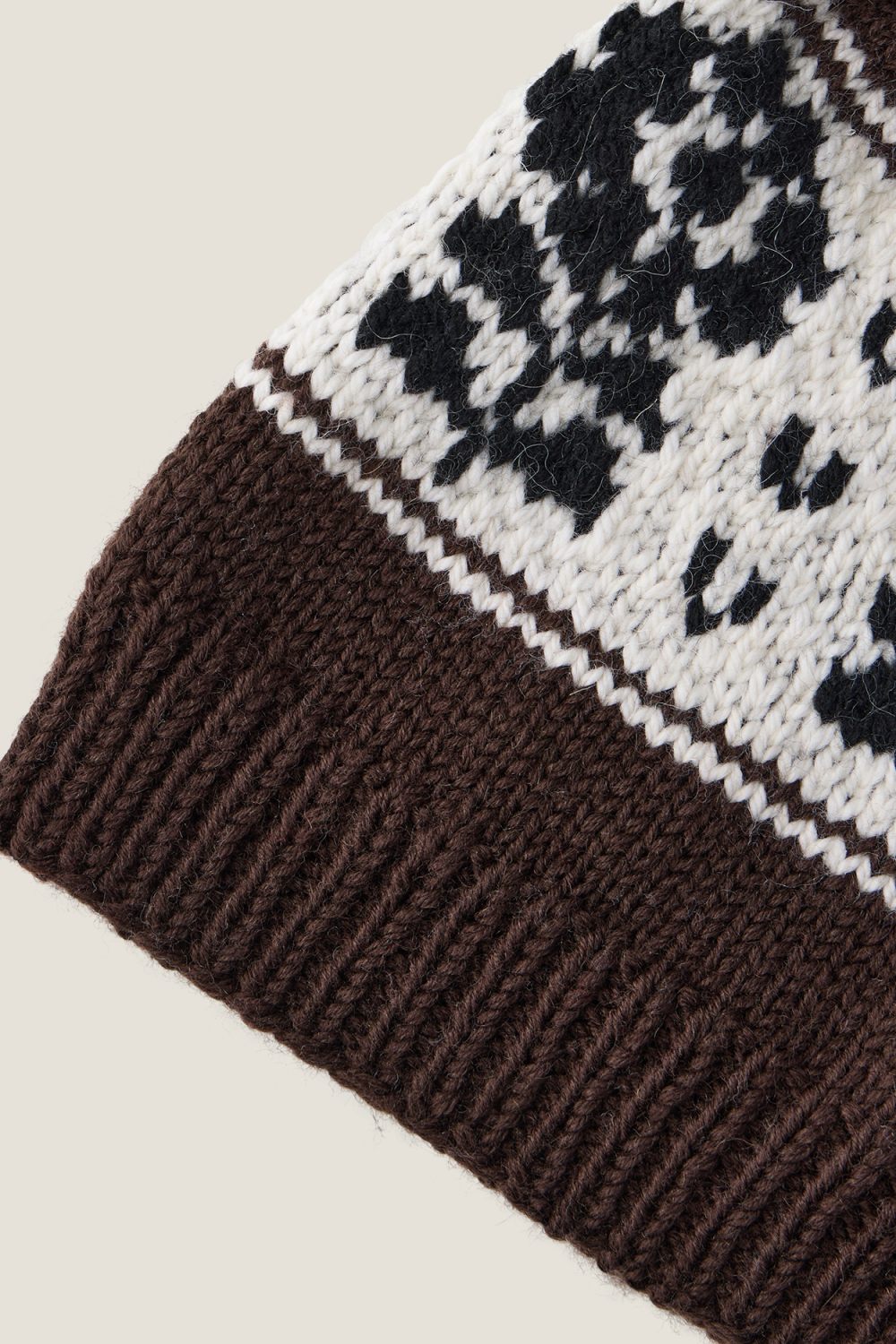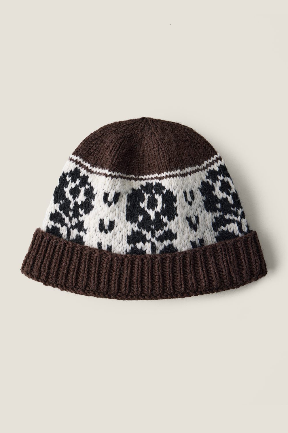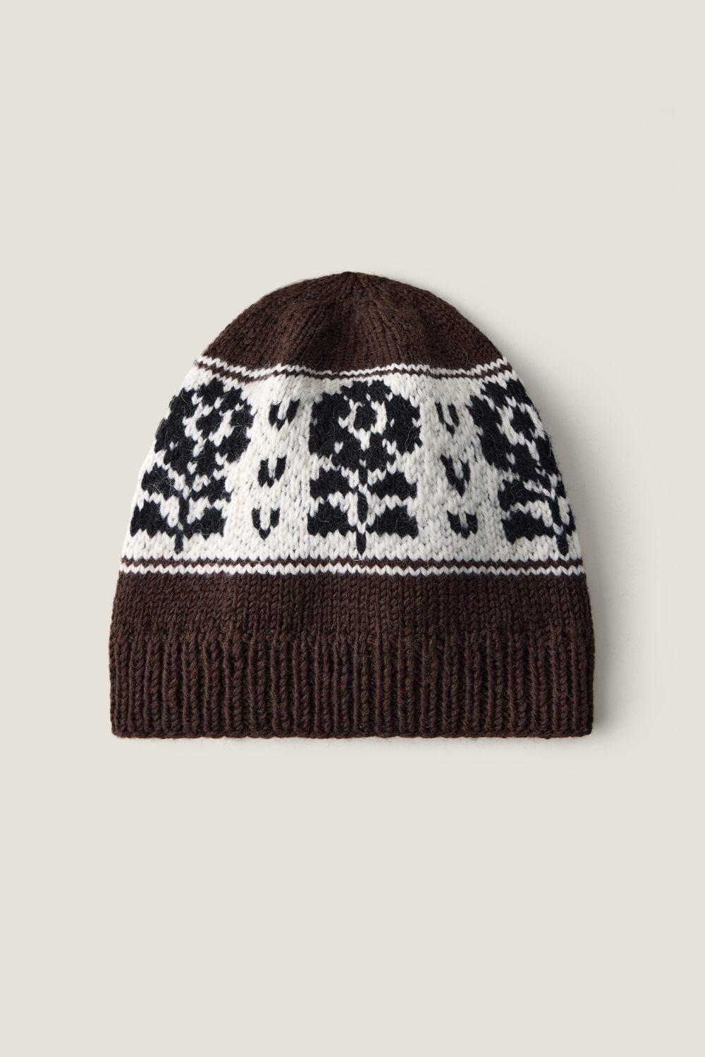Вязаная шапка-бини из 100% натуральной шерсти коричневого цвета. Каждая шапка создается вручную, процесс занимает около 6 часов. Элементы вяжутся жаккардом, волокна которого сцепляются между собой. Это делает изделия плотными и теплыми благодаря протяжкам нитей на изнанке.