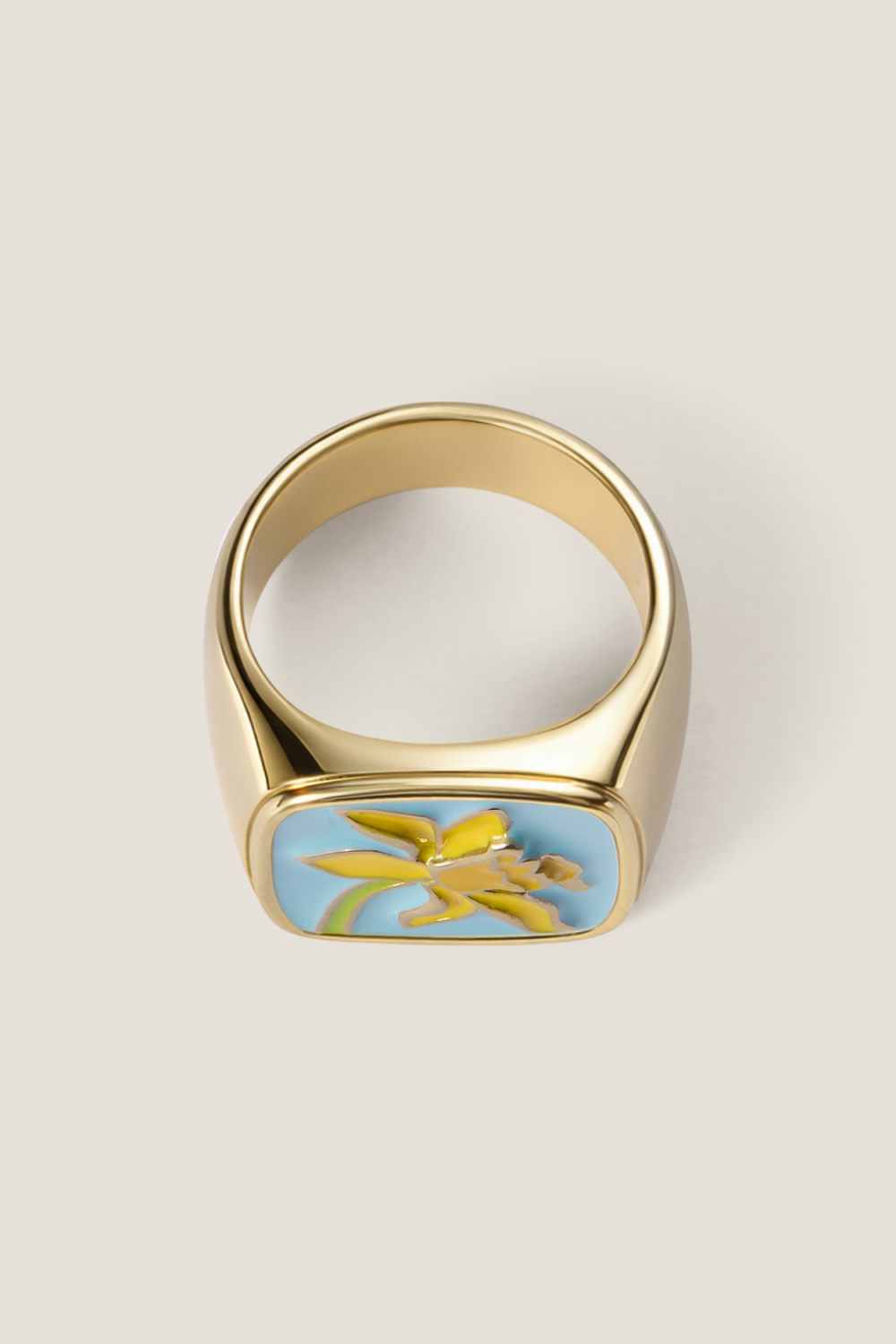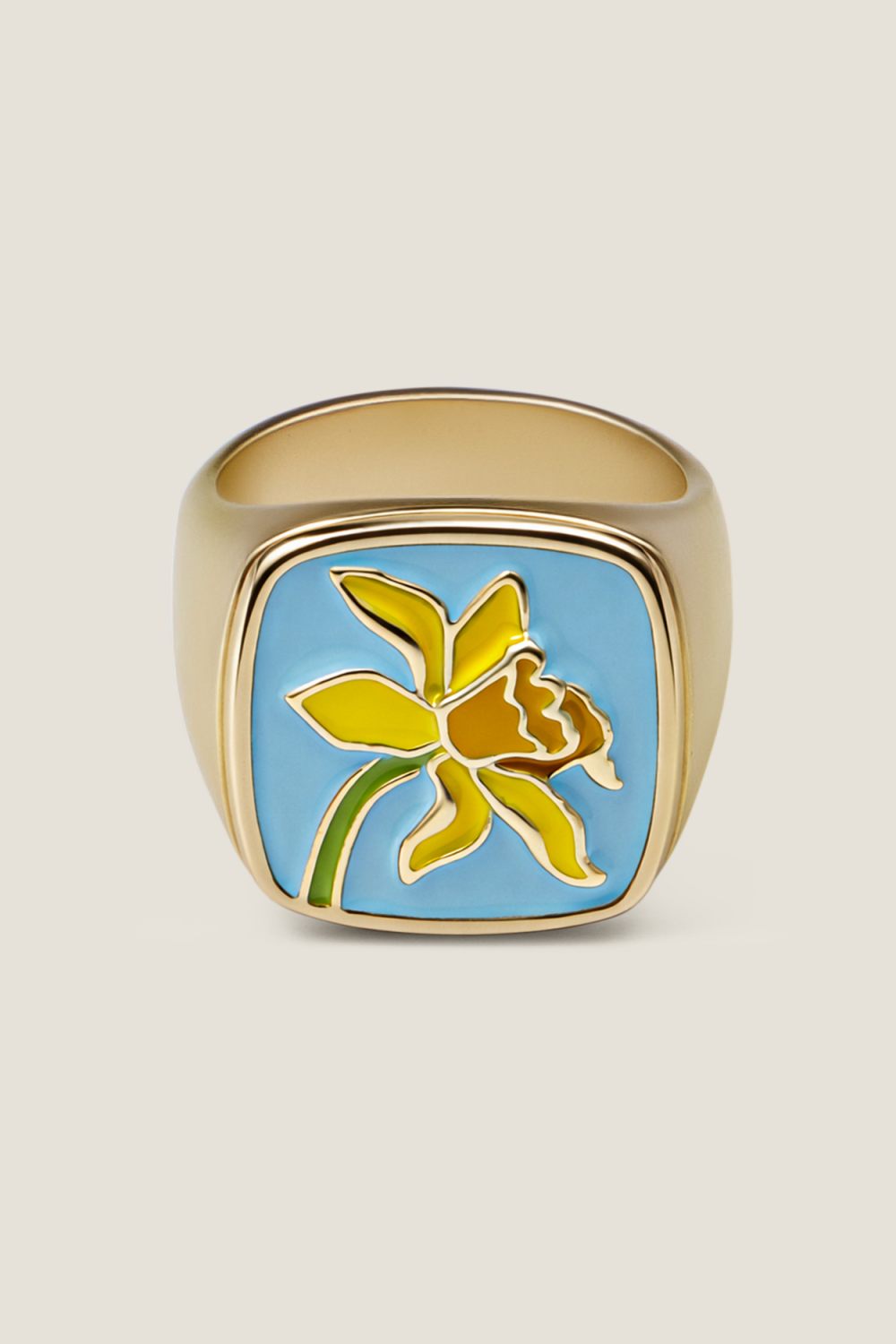 Кольцо-печатка из латуни из коллекции Tears of Bloom. Матовое покрытие под золото. Ручная работа рисунка нарцисса выполнена из эмали. Внутри кольца гравировка логотипа TEARS OF. Размер: 18. Упаковка в мягкий тканевый мешочек и коробку с логотипом TEARS OF.
