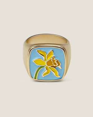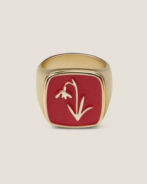 Кольцо-печатка из латуни из коллекции Tears of Bloom. Матовое покрытие под золото. Ручная работа рисунка подснежника выполнена из эмали. Внутри кольца гравировка логотипа TEARS OF. Размер: 18. Упаковка в мягкий тканевый мешочек и коробку с логотипом TEARS OF.