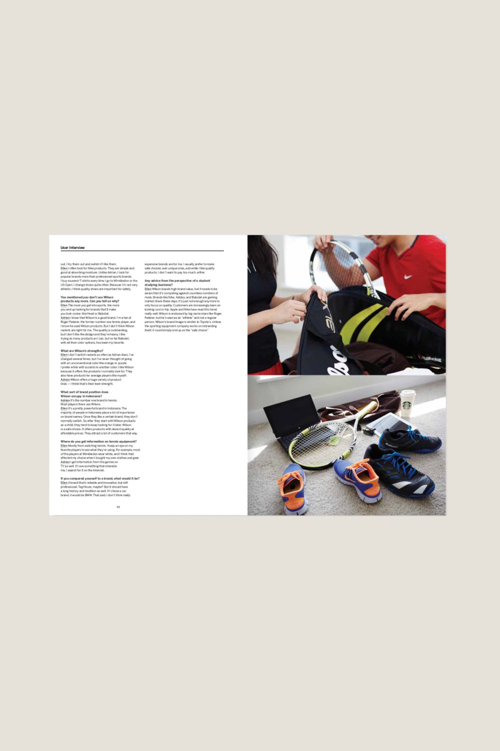 WILSON впервые появилась в Чикаго, штат Иллинойс, в 1913 году как идея производить струны для теннисных ракеток и хирургические нити из побочных продуктов животных со скотобоен компании. В настоящее время компания предлагает качественную продукцию для большинства видов спорта с мячом, включая теннис, бейсбол и баскетбол. В отличие от конкурирующих компаний, которые подчеркивают динамичный или мощный имидж, WILSON выделяется, создавая имидж бренда, наполненный дружелюбием.
