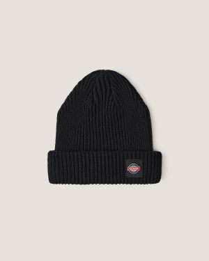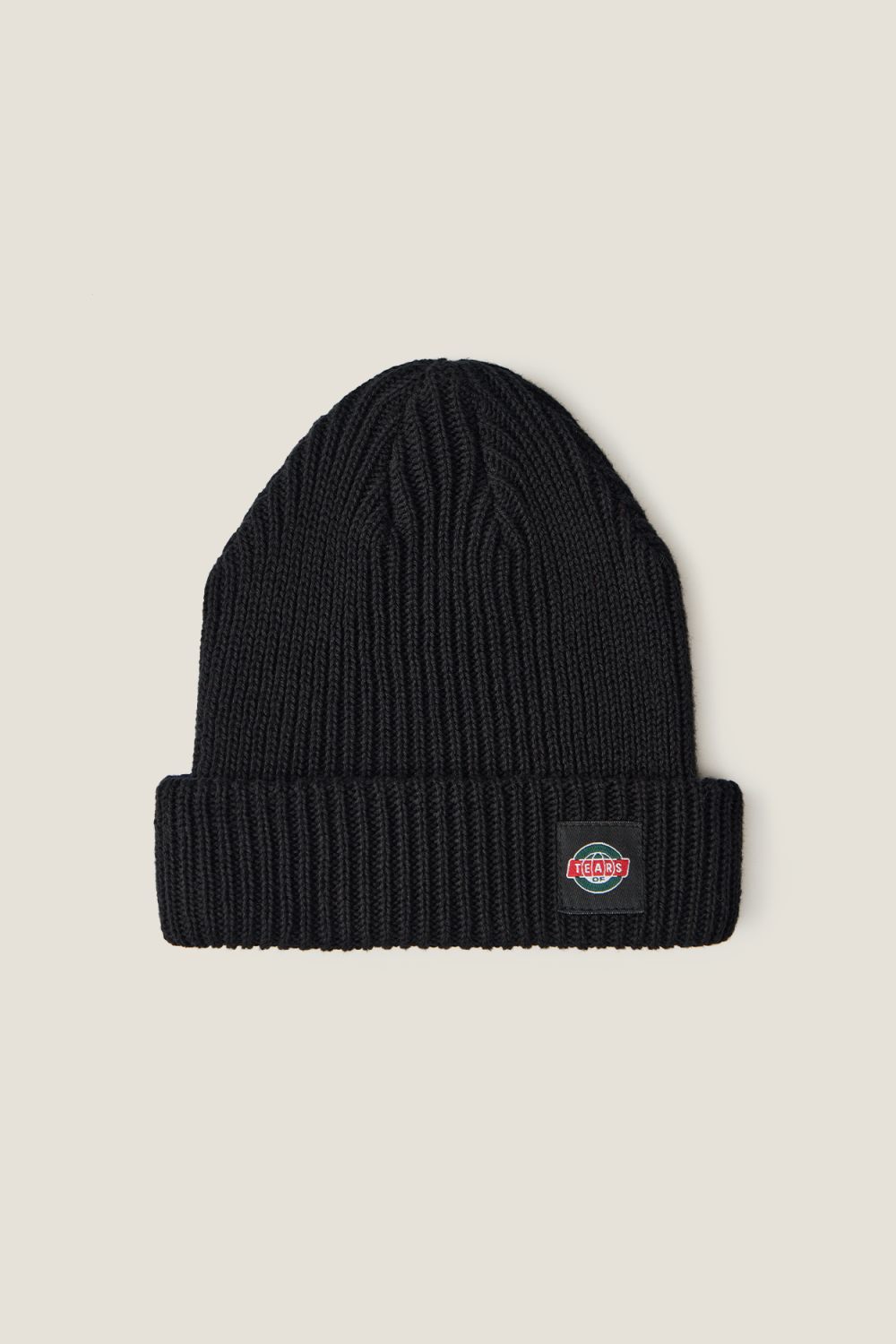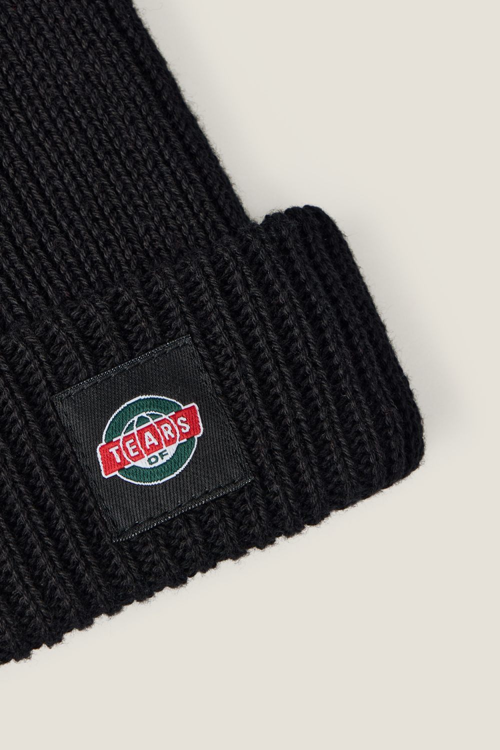 Вязаная шапка в рубчик. Жаккардовый лейбл на отвороте. Цвет шапки: черный.