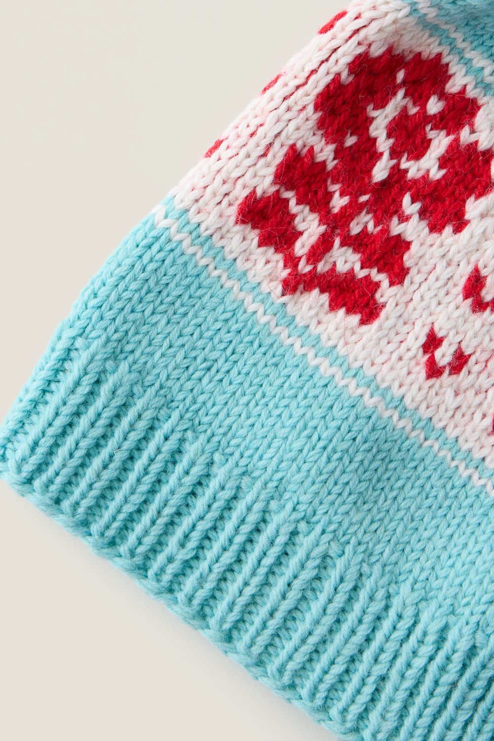 Вязаная шапка-бини из 100% натуральной шерсти голубого цвета. Каждая шапка создается вручную, процесс занимает около 6 часов. Элементы вяжутся жаккардом, волокна которого сцепляются между собой. Это делает изделия плотными и теплыми благодаря протяжкам нитей на изнанке.