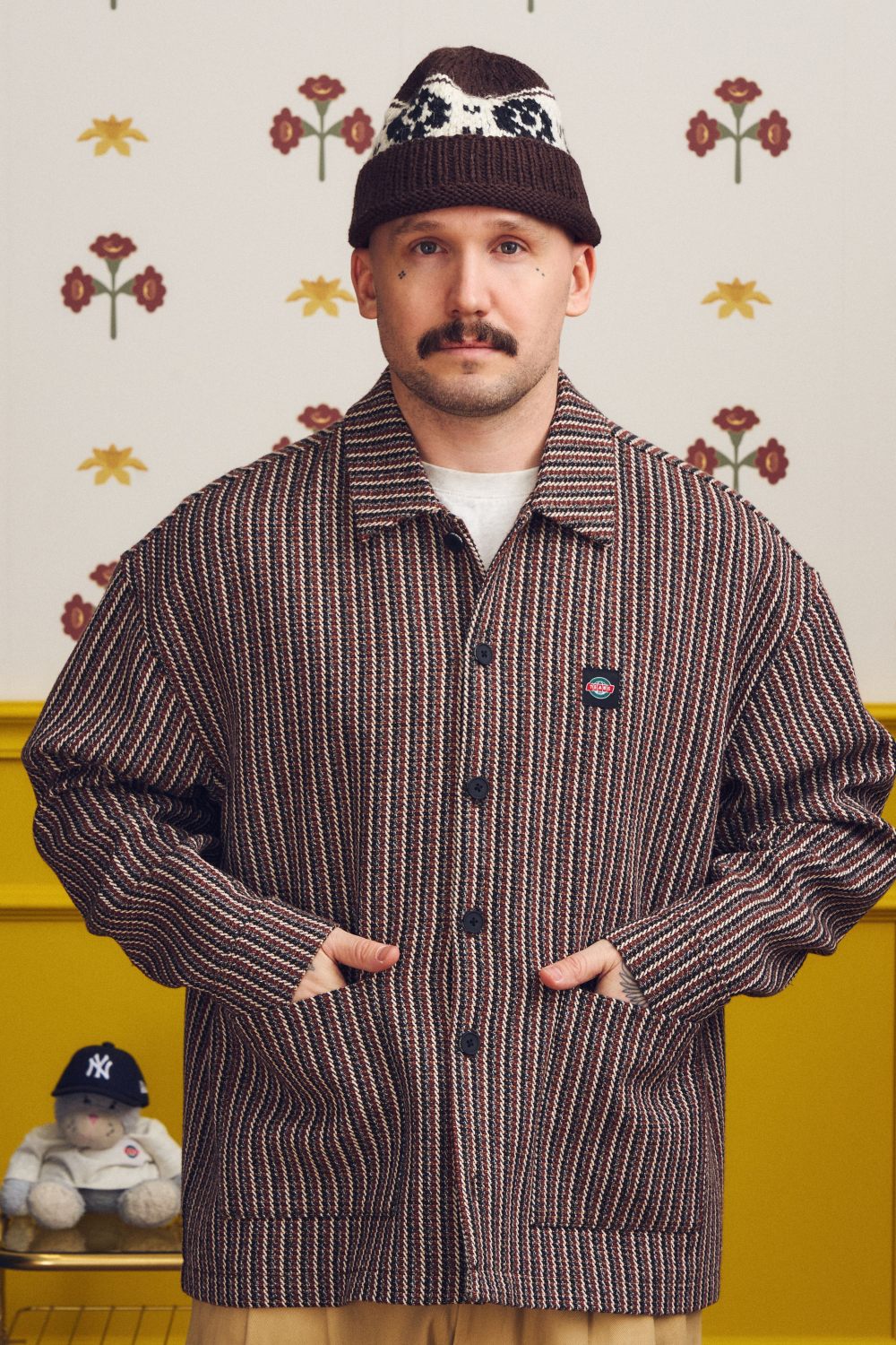 Вязаная шапка-бини из 100% натуральной шерсти коричневого цвета. Каждая шапка создается вручную, процесс занимает около 6 часов. Элементы вяжутся жаккардом, волокна которого сцепляются между собой. Это делает изделия плотными и теплыми благодаря протяжкам нитей на изнанке.