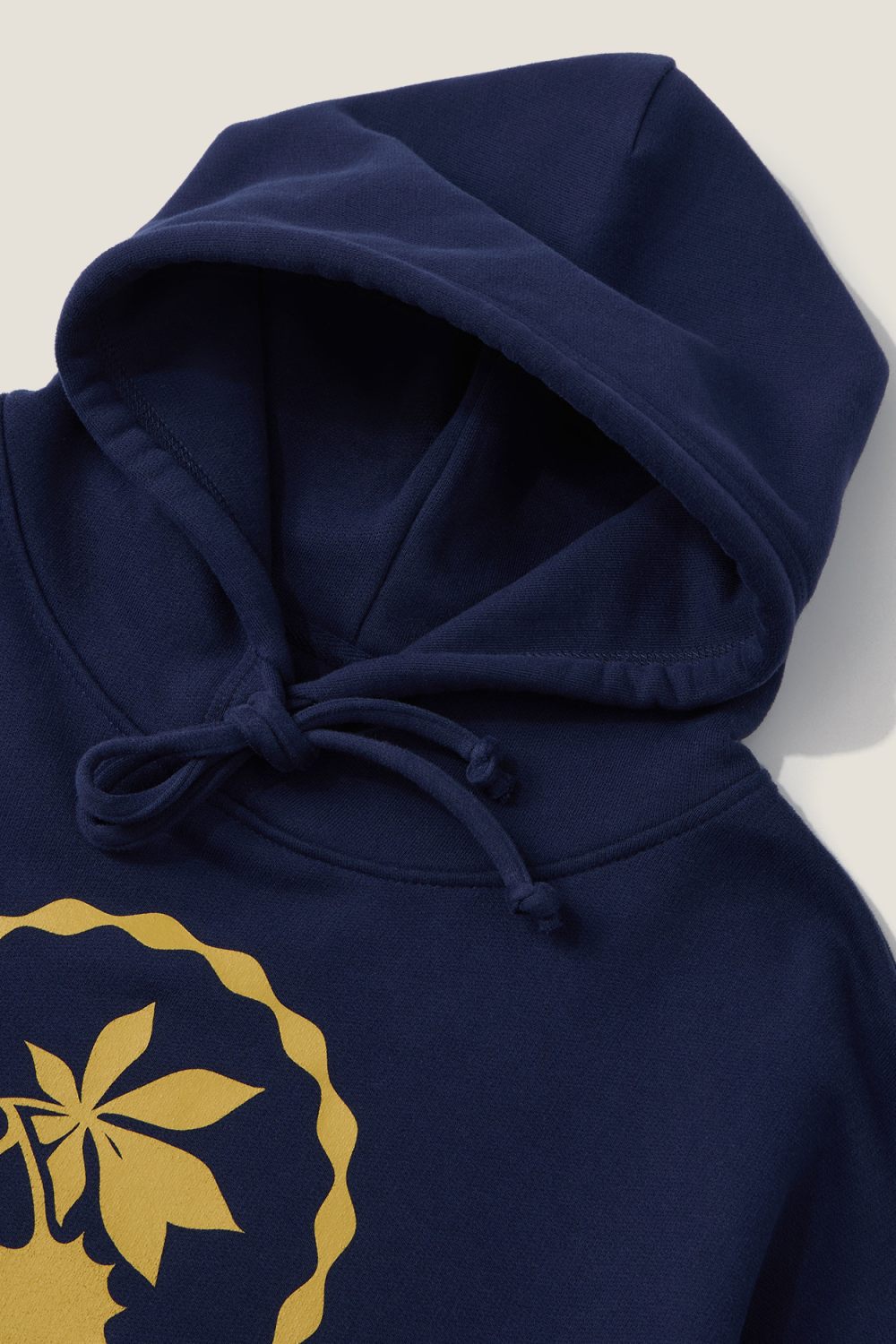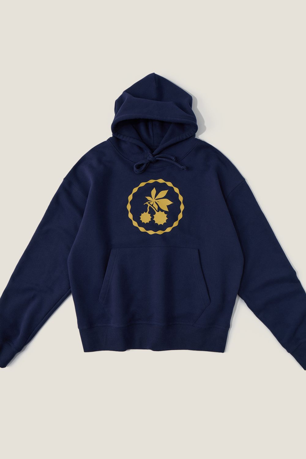 Худи свободного кроя с петельной текстурой полотна из 100% хлопкового футера с мягкой изнанкой из коллекции TEARS of Aparté. Накладной карман-кенгуру спереди. Принт каштана желтого цвета в области груди. Капюшон на завязках. Цвет: синий.