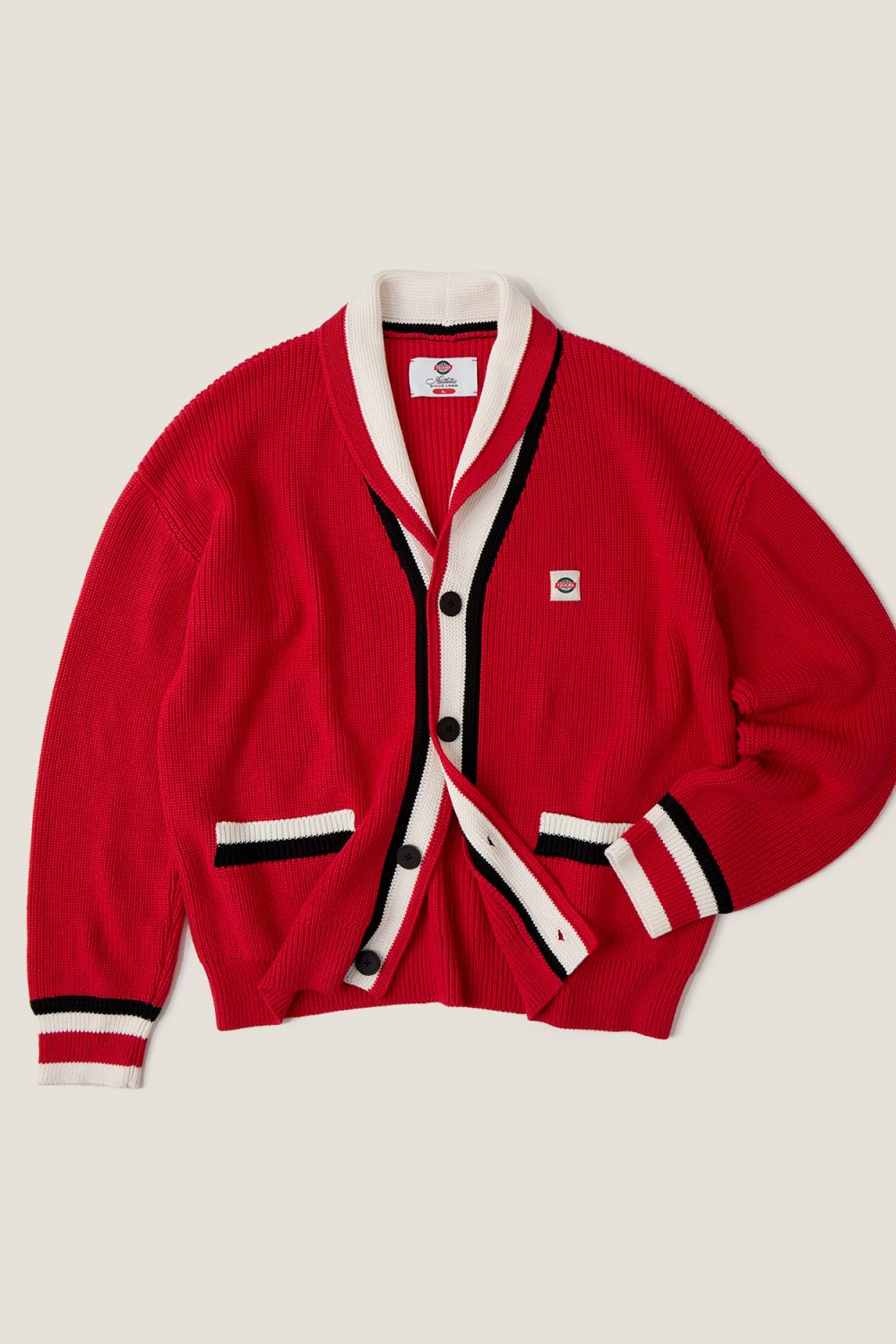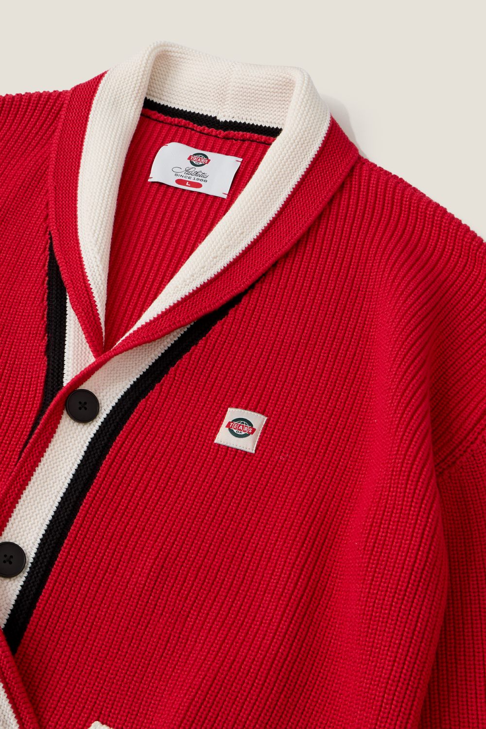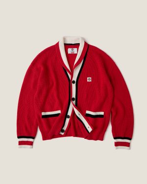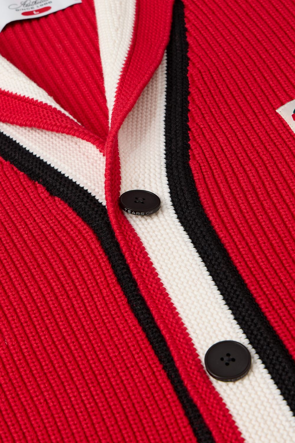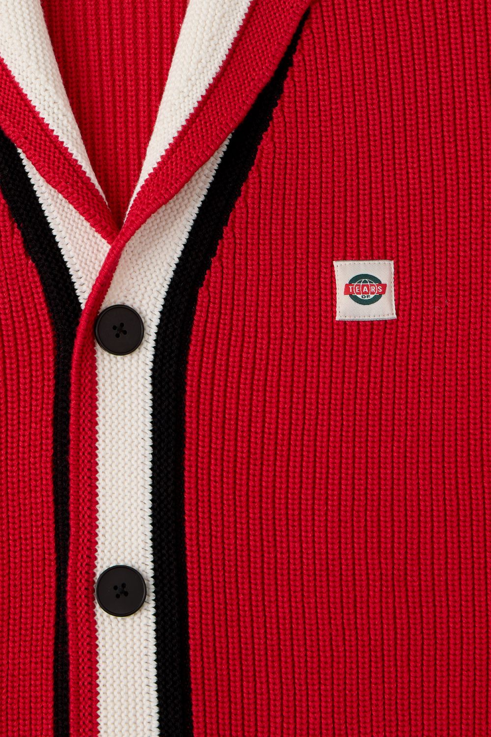 Вязаный кардиган из смесового хлопка с контрастной отделкой горловины и манжетов. Ажурная вязка. 2 накладных кармана. Фирменный нашивной лейбл в области груди. Тип застежки: пуговицы. Цвет: красный