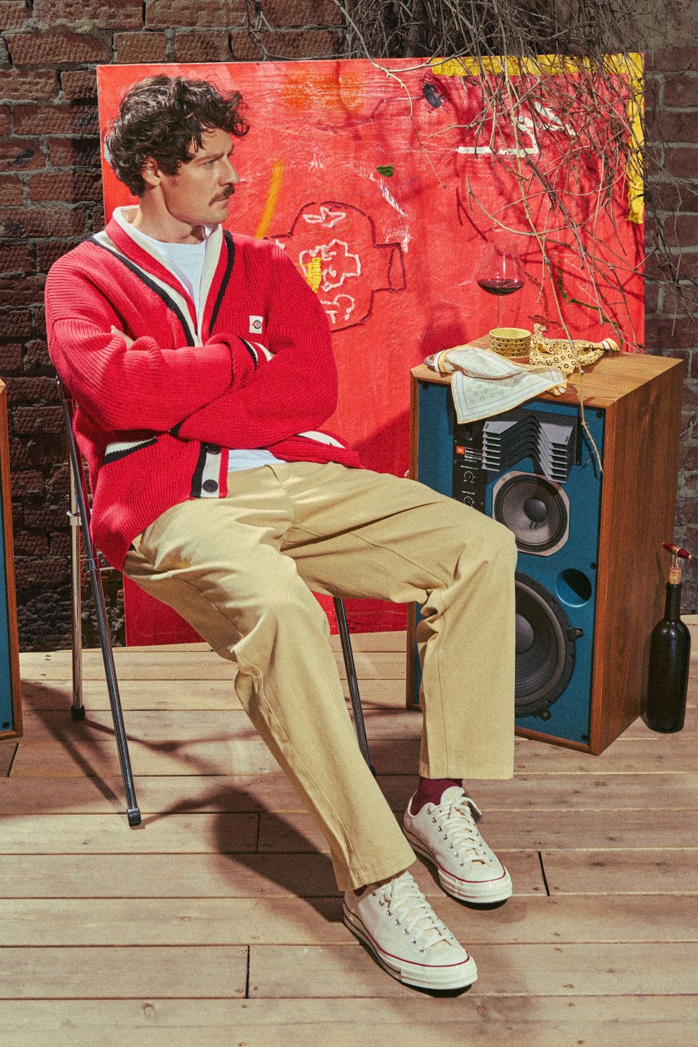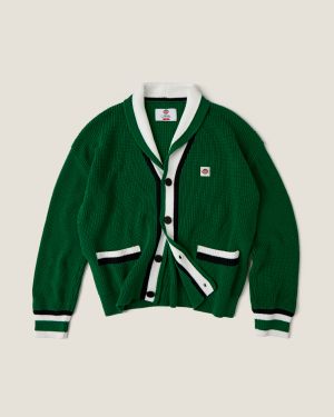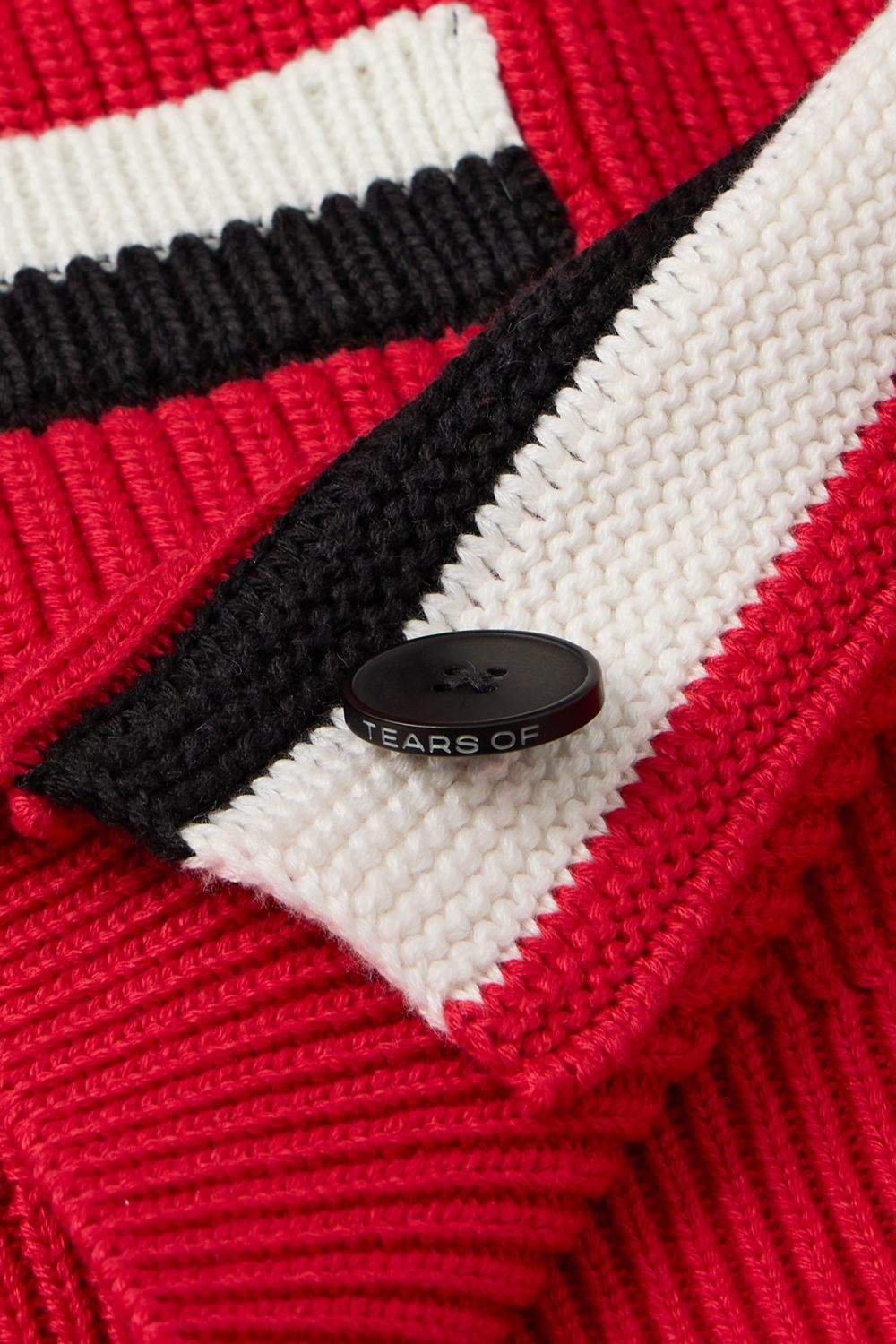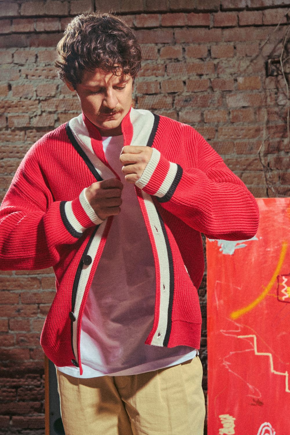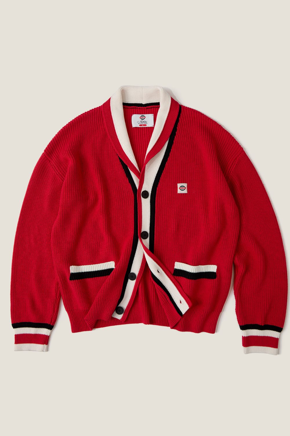 Вязаный кардиган из смесового хлопка с контрастной отделкой горловины и манжетов. Ажурная вязка. 2 накладных кармана. Фирменный нашивной лейбл в области груди. Тип застежки: пуговицы. Цвет: красный