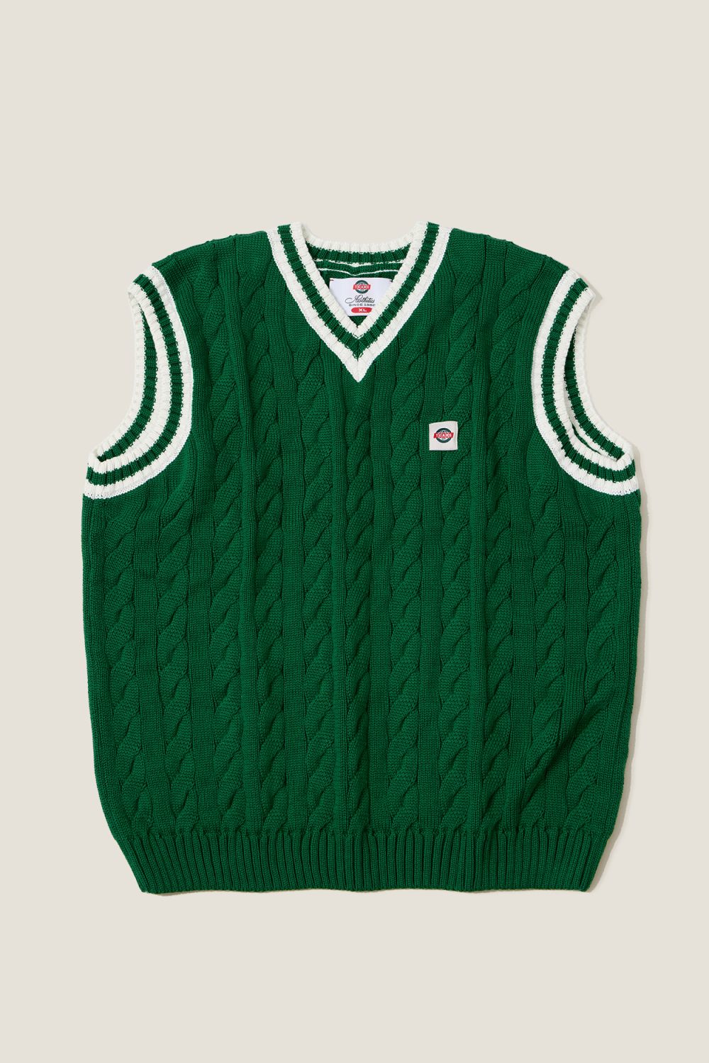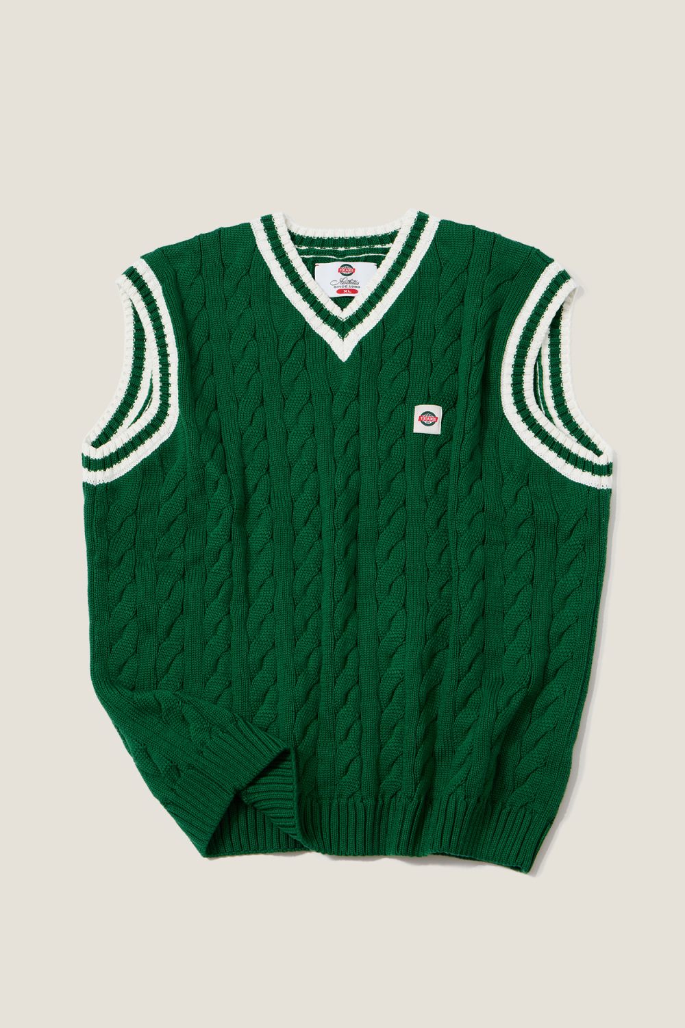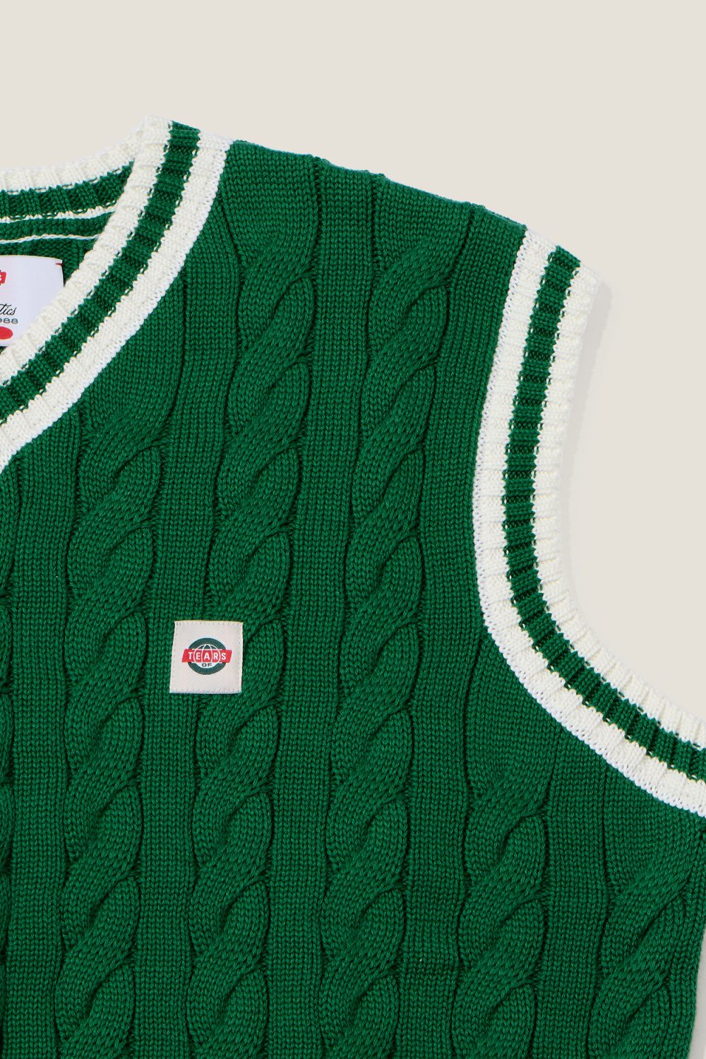 Вязаный жилет зеленого цвета, с контрастной отделкой горловины и пройм. Крупная вязка. V-образный вырез. Эластичная манжета по низу и на пройме рукавов. Фирменный нашивной лейбл в области груди.