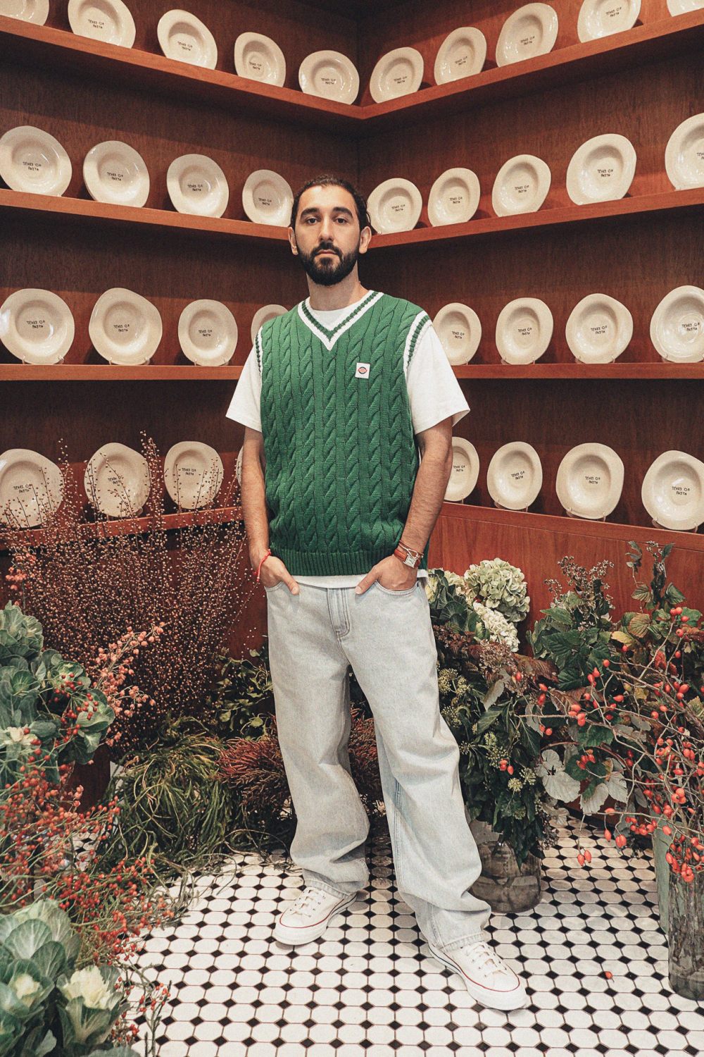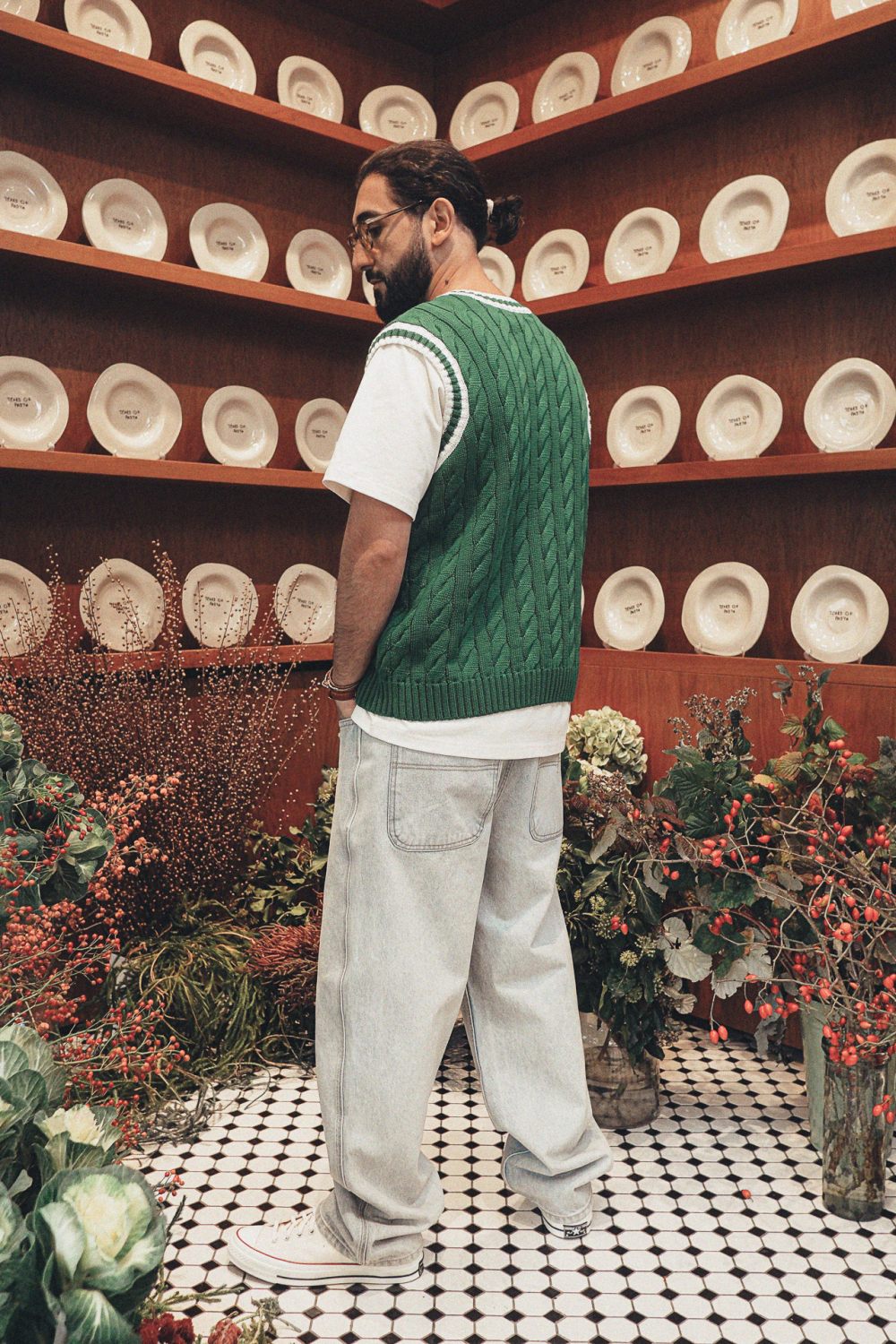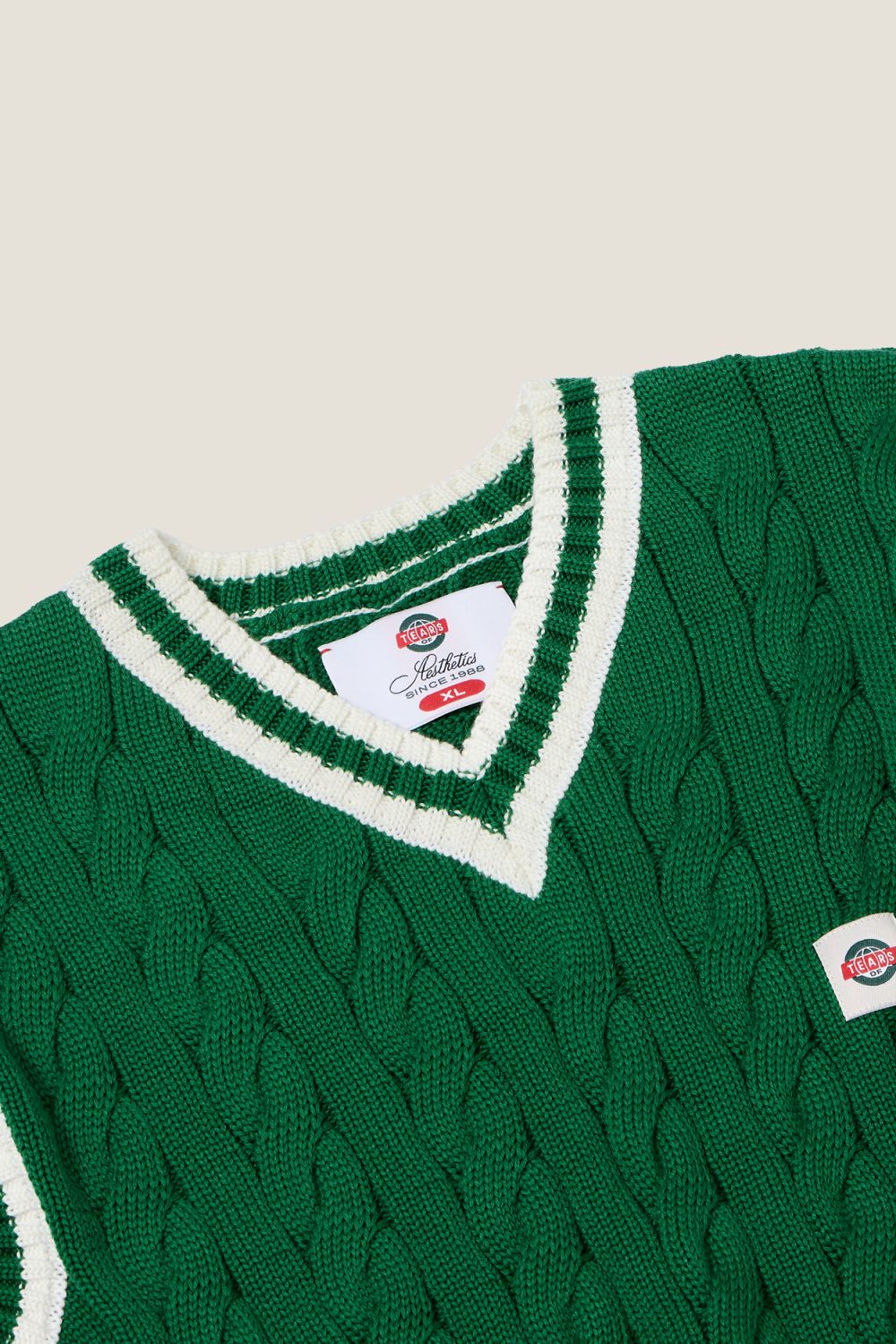 Вязаный жилет зеленого цвета, с контрастной отделкой горловины и пройм. Крупная вязка. V-образный вырез. Эластичная манжета по низу и на пройме рукавов. Фирменный нашивной лейбл в области груди.