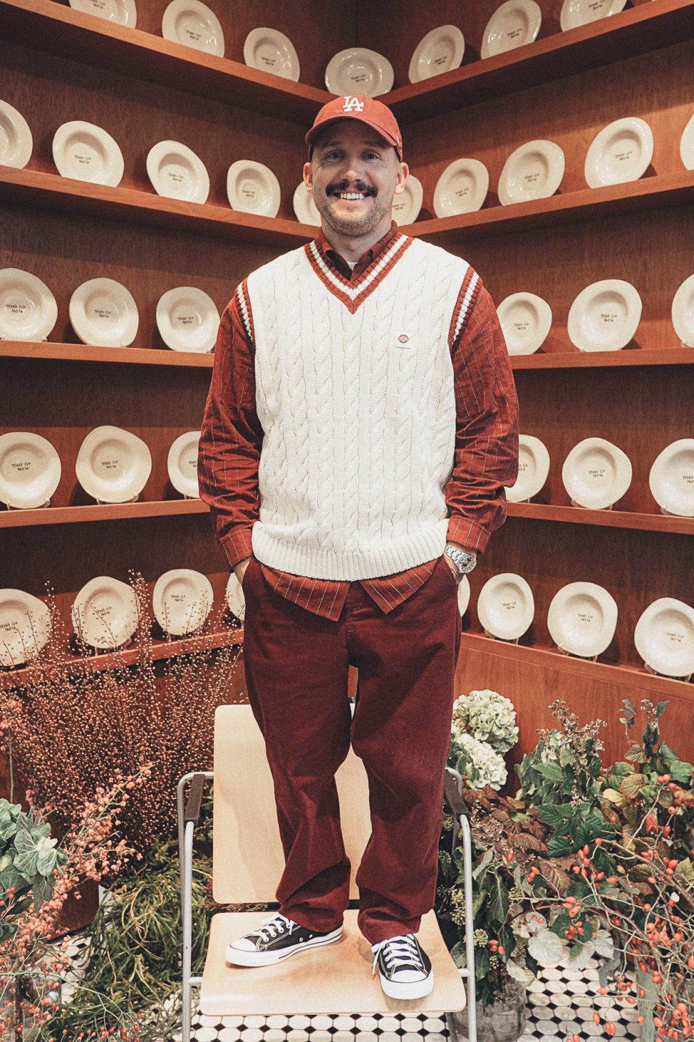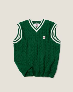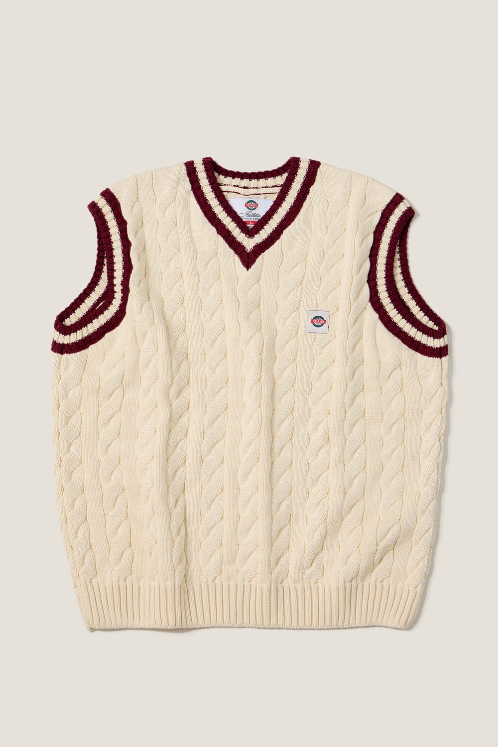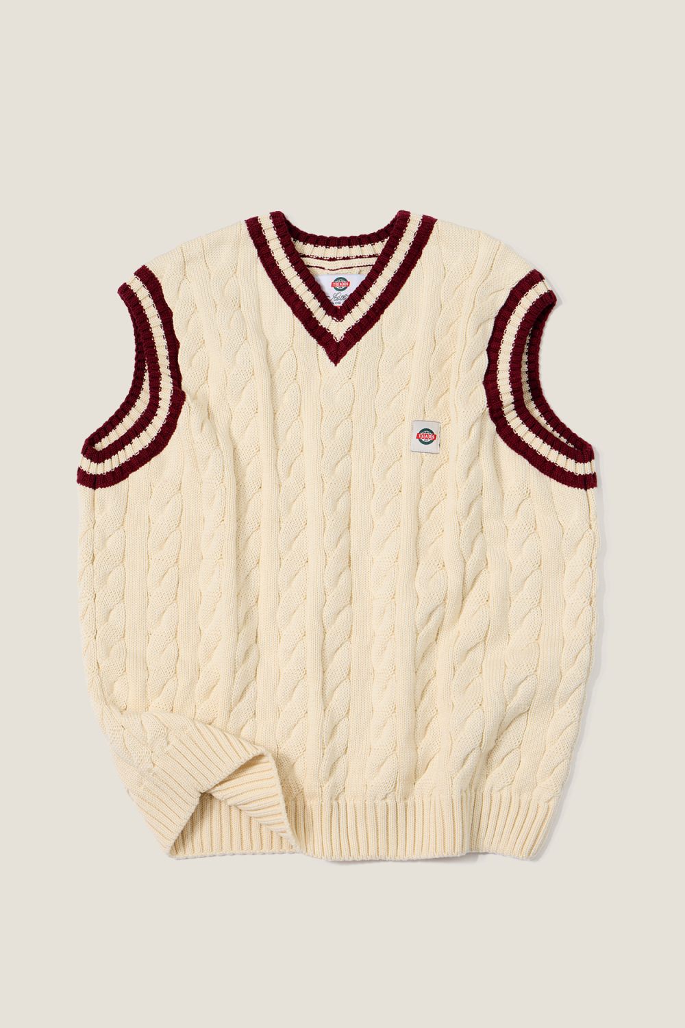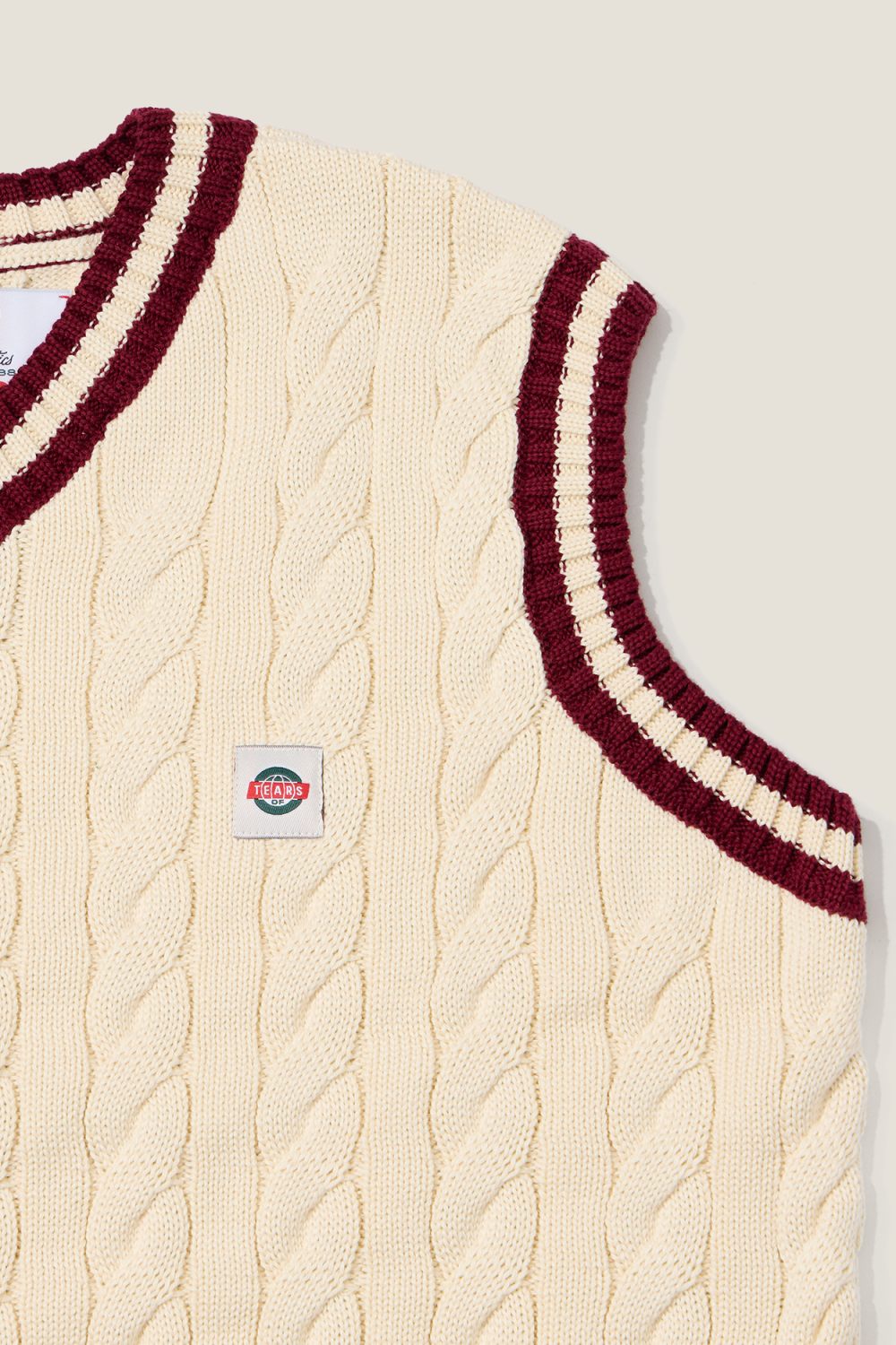 Вязаный жилет молочного цвета, с контрастной отделкой горловины и пройм. Крупная вязка. V-образный вырез. Эластичная манжета по низу и на пройме рукавов. Фирменный нашивной лейбл в области груди.