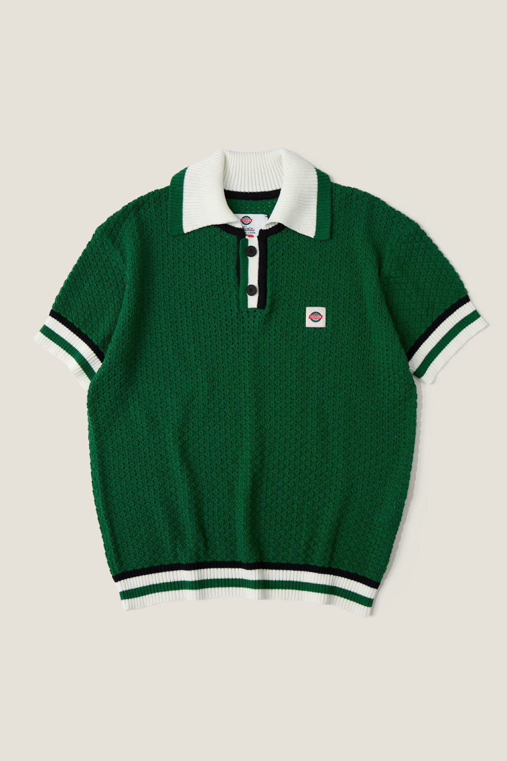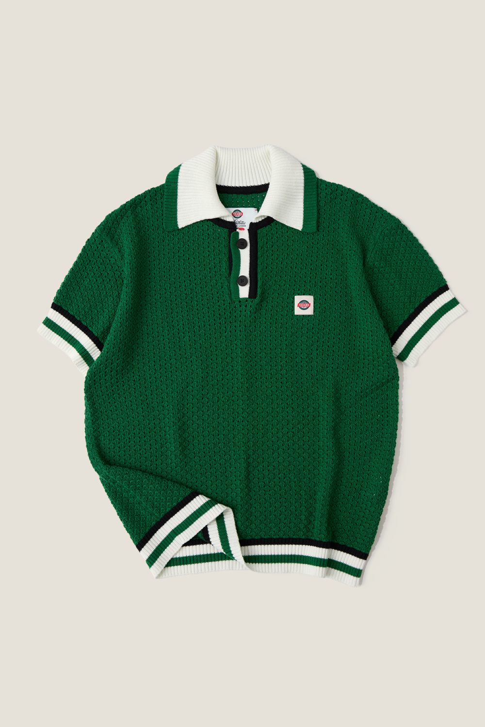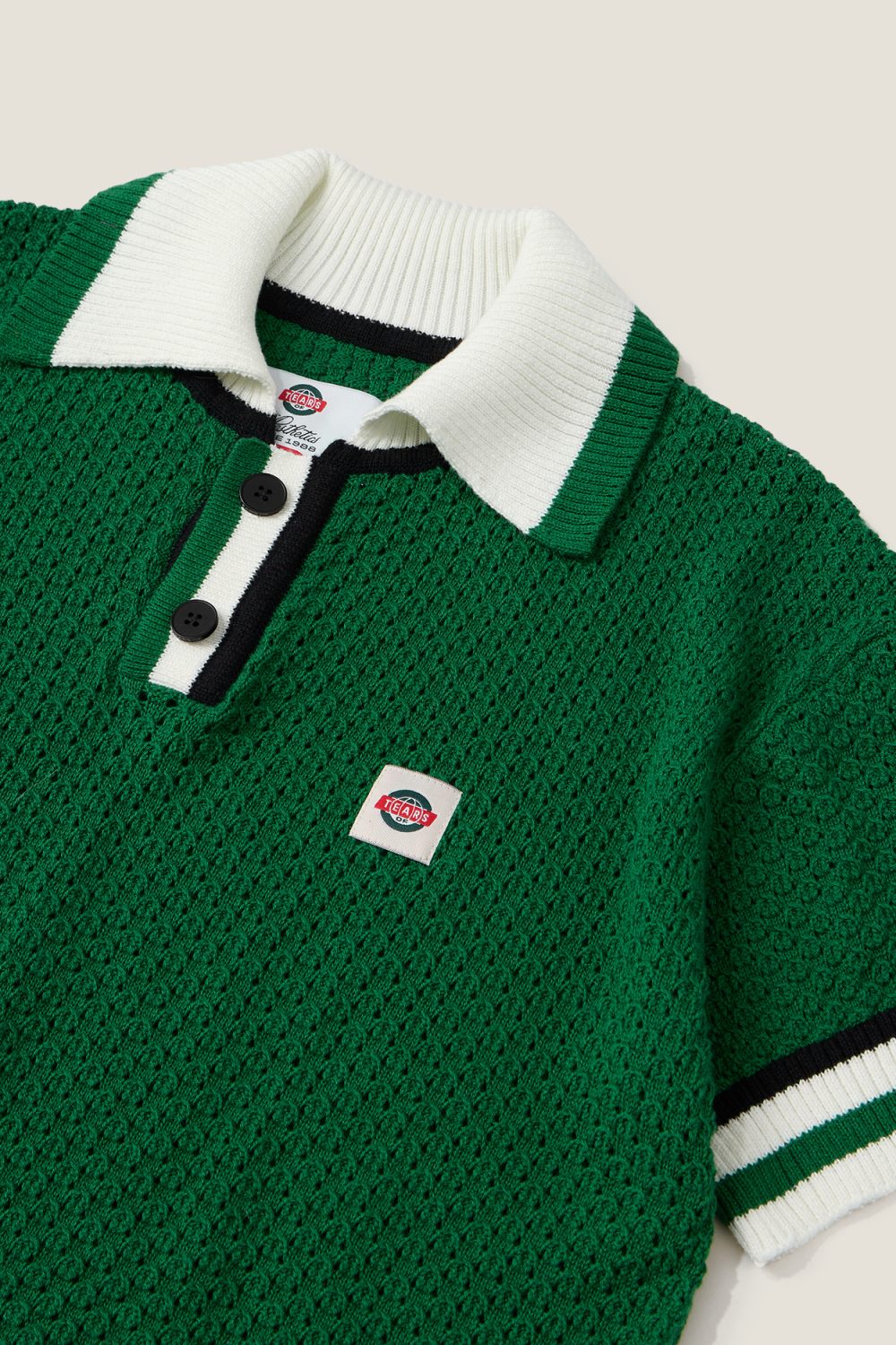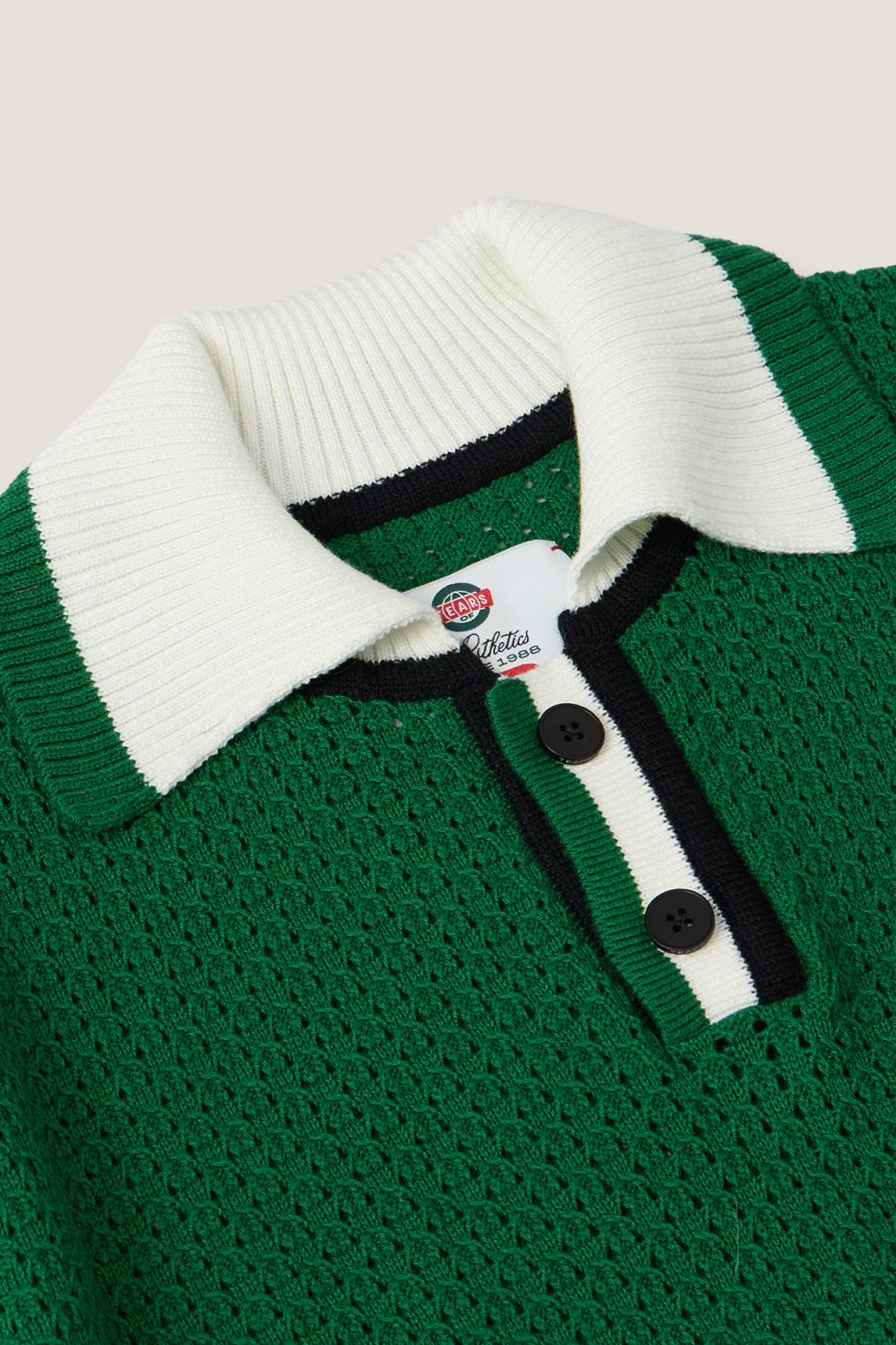 Вязаное поло из смесового хлопка. Отложной воротник белого цвета. Ажурная вязка. Фирменный нашивной лейбл в области груди. Тип застежки: пуговицы. Цвет: зеленый.