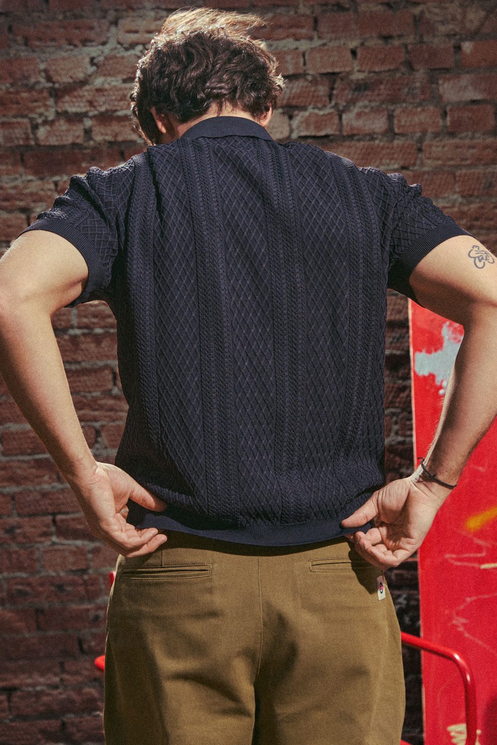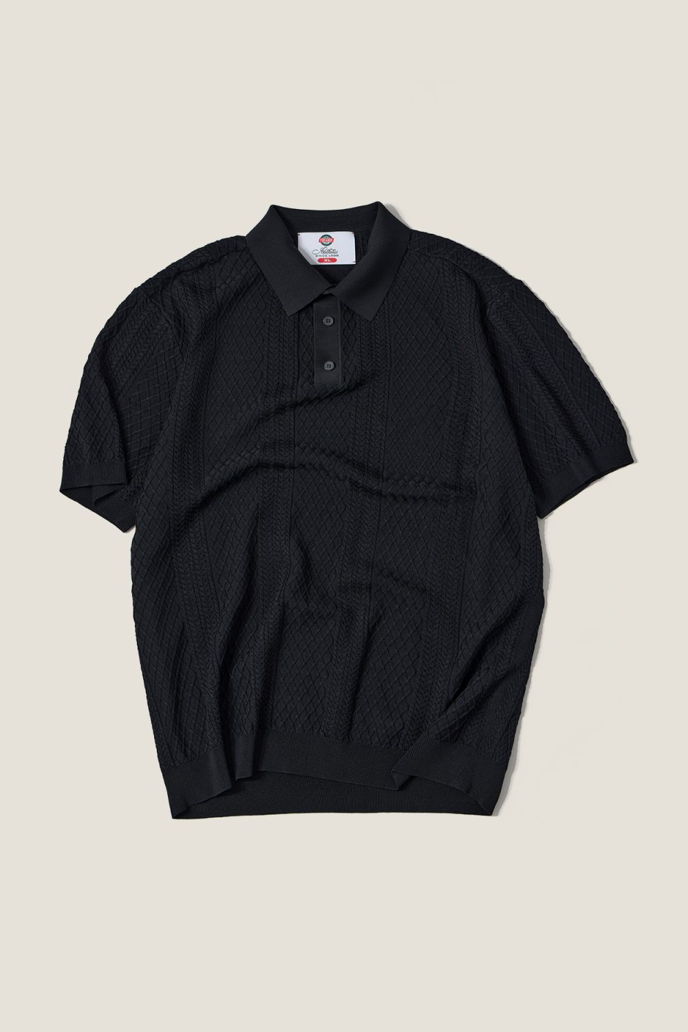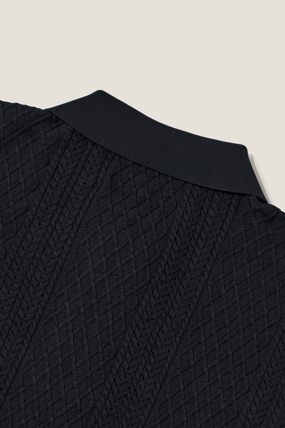 Вязаное поло из смесовой вискозы. Мягкая и приятная к телу ткань. Отложной воротник. Ажурная вязка. Тип застежки: пуговицы в тон изделия. Цвет: черный.