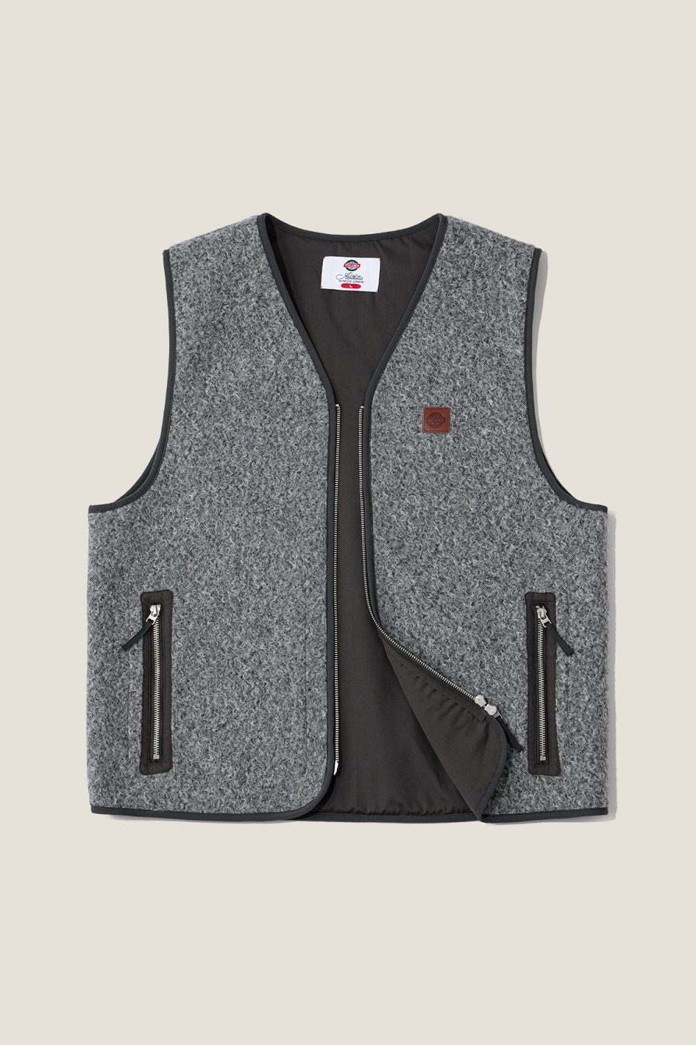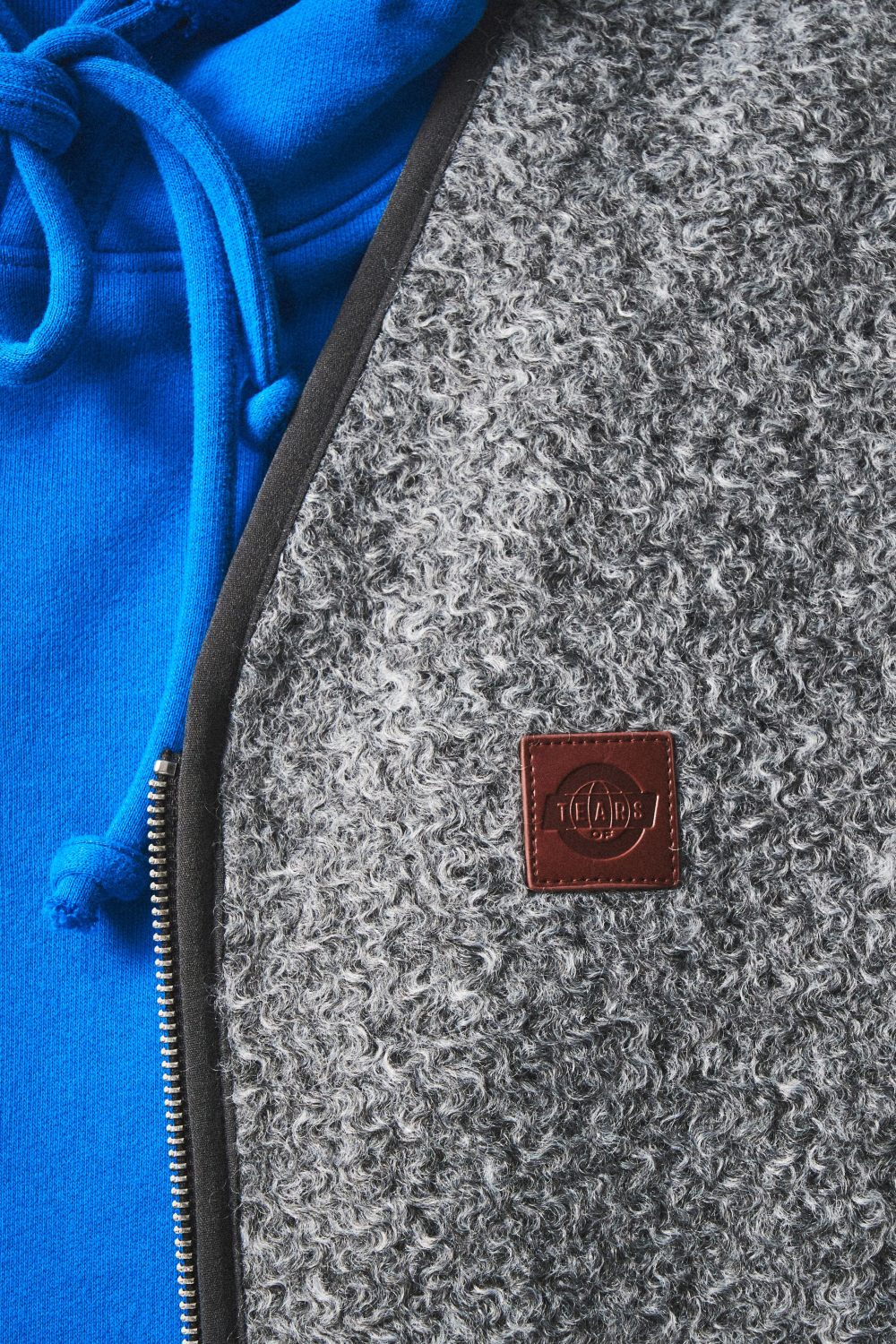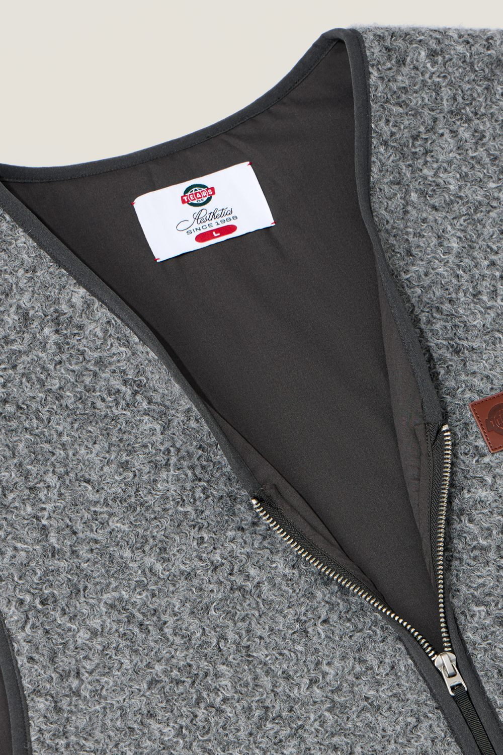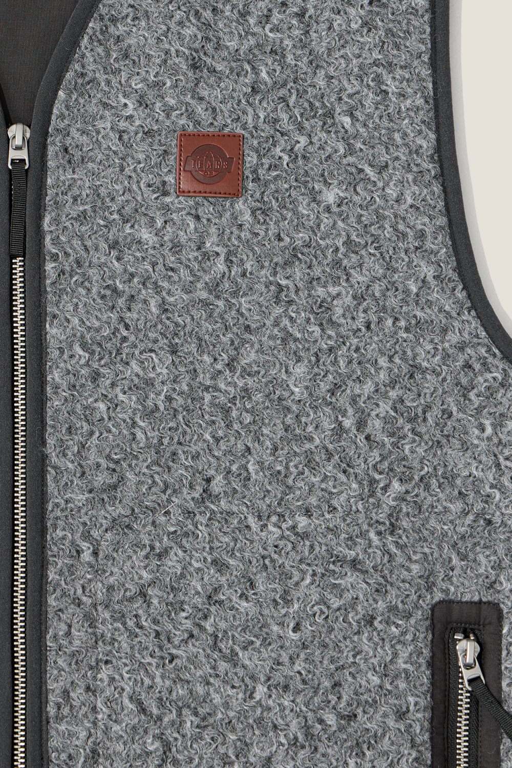 Жилет серого цвета из коллекции TEARS of Aparté. Верх изделия имеет фактуру шерсти. Скрытые боковые карманы на молнии. Подклад серого цвета. Жаккардовый флажок с логотипом на спинке изделия. Кожаный нашивной лейбл коричневого цвета в области груди. Тип застежки: молния.