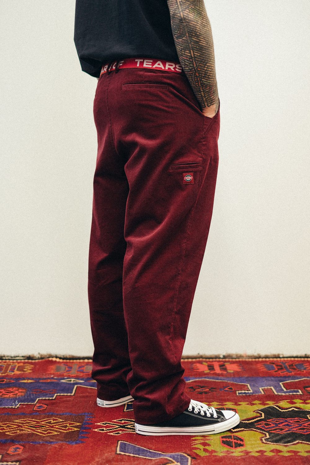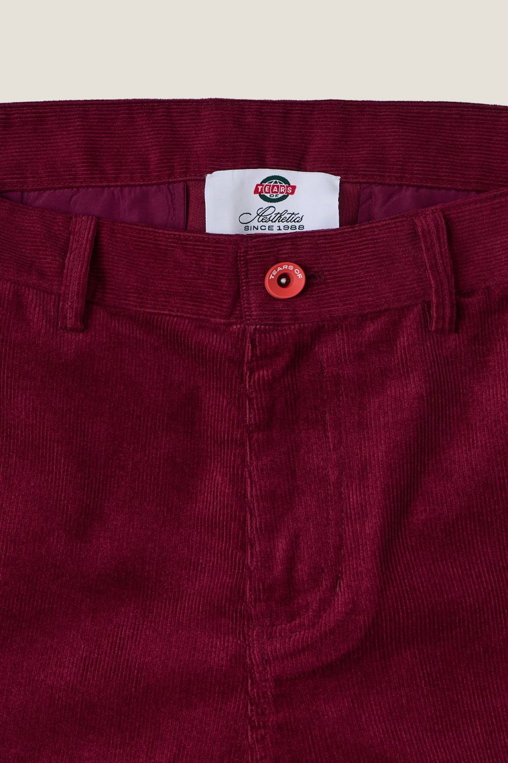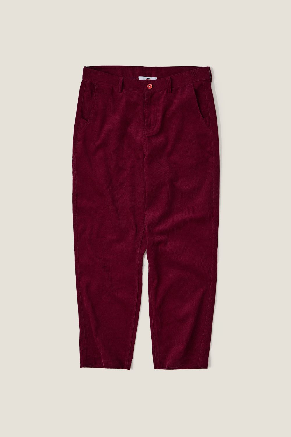 Вельветовые брюки прямого кроя из 100% хлопка. Карманы: два боковых, два задних прорезных и один на бедре. Застежка на молнию и пуговицу с контрастным эмбоссированием. Жаккардовый флажок с логотипом изнутри на нижнем крае штанины, фирменный лейбл под карманом на бедре. Цвет: винный.