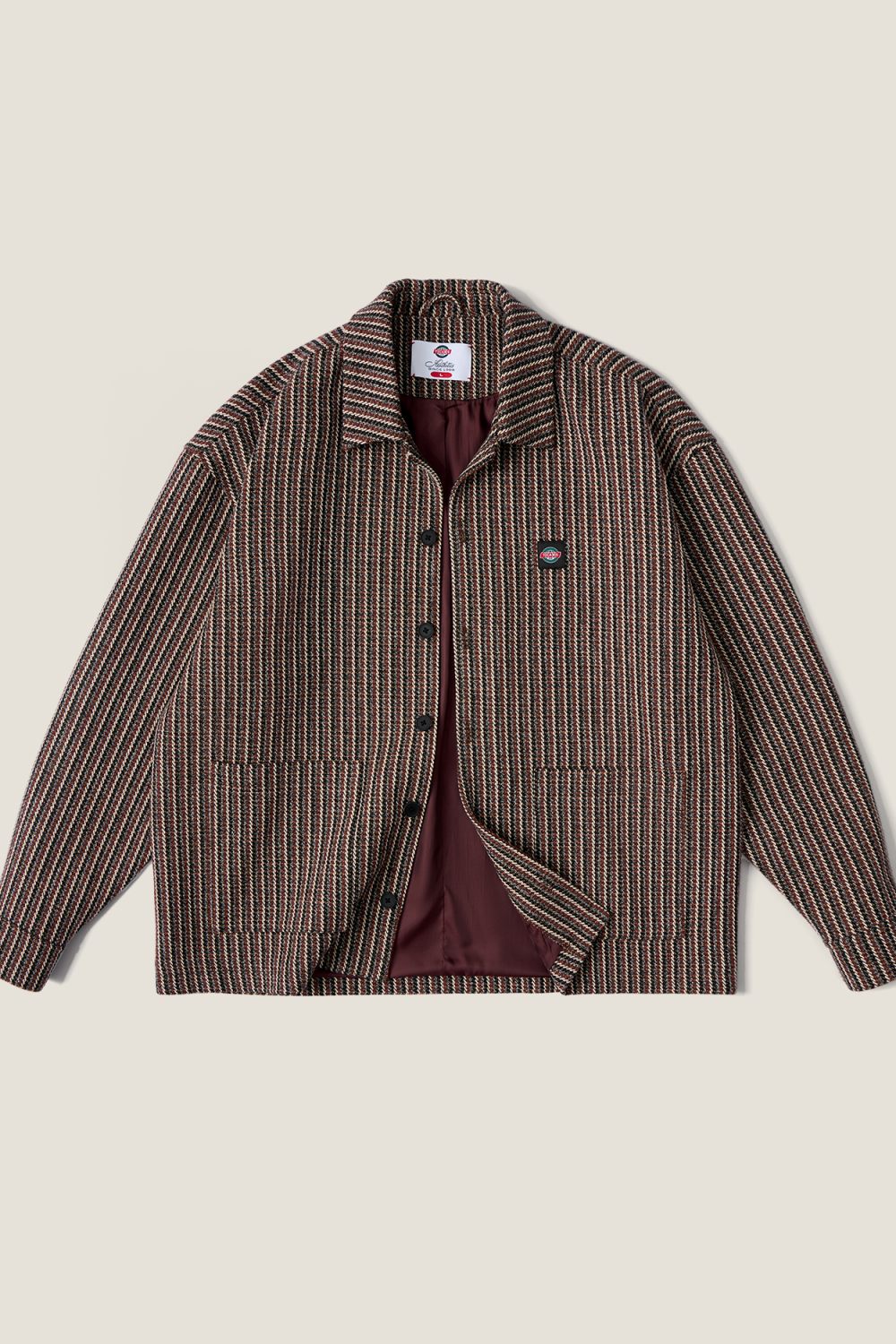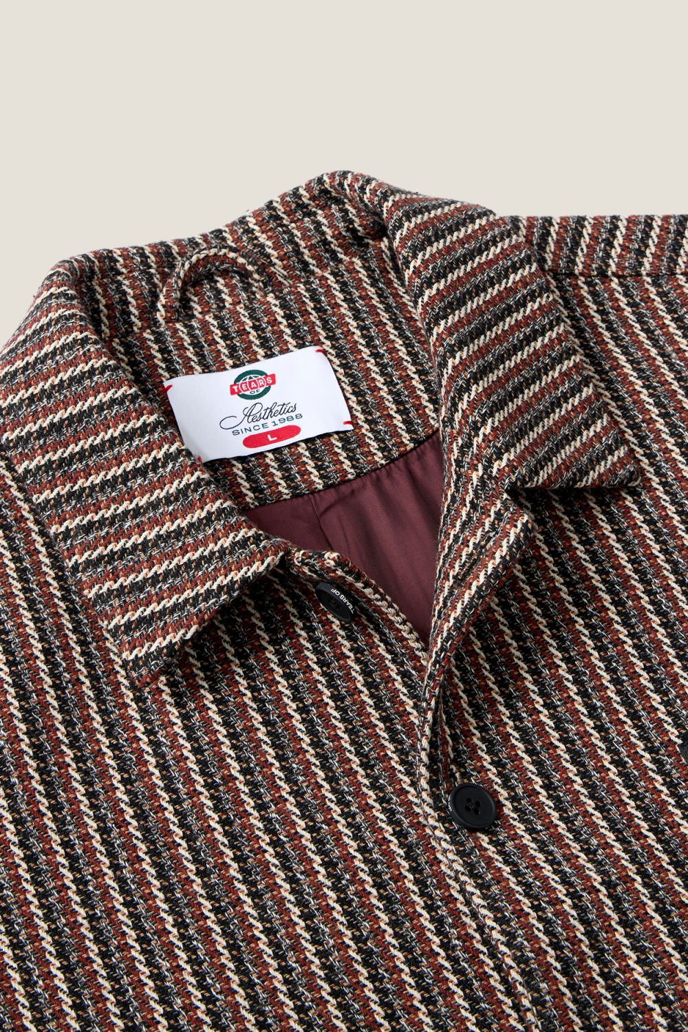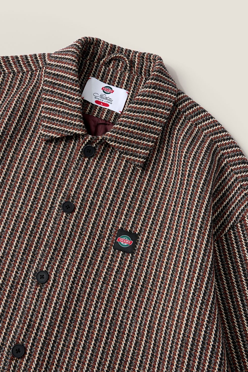 Полосатая куртка свободного кроя из смесовой шерсти. Отложной воротник. Накладные карманы спереди, брендированные черные пуговицы. Подклад коричневого цвета. Фирменный лейбл на груди. Жаккардовый флажок с логотипом на спинке. Цвет: коричневый.