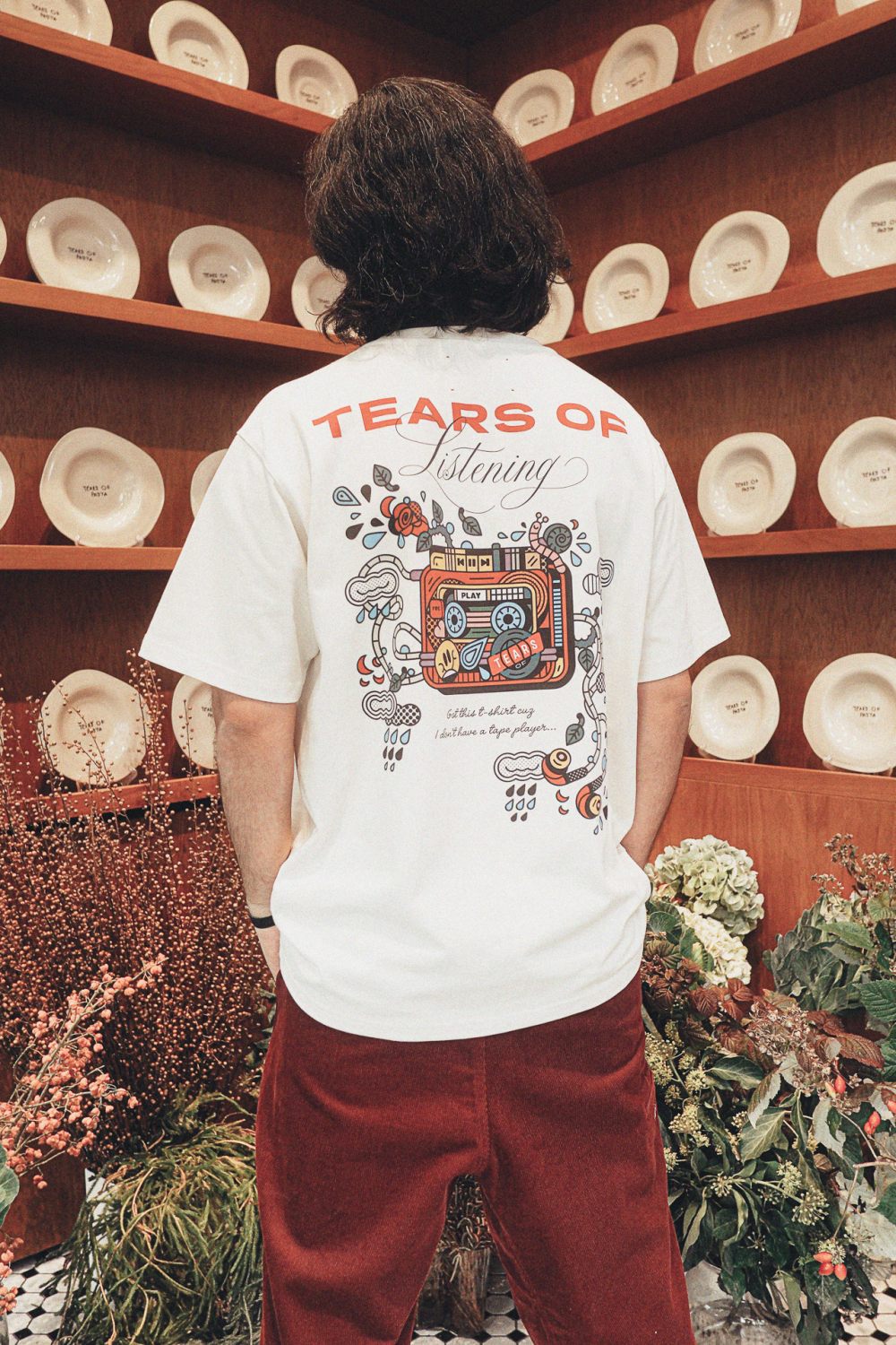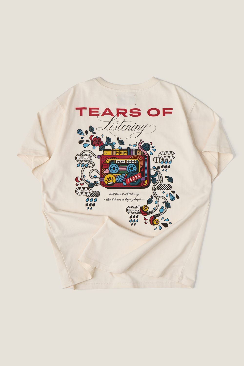 Лимитированная коллекция футболок TEARS OF LISTENING. Специально разработанный принт с кассетным плеером на спинке. Принт фирменного логотипа на груди. Цвет футболки: молочный.